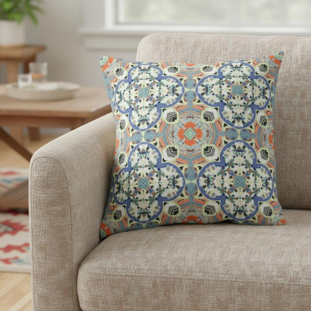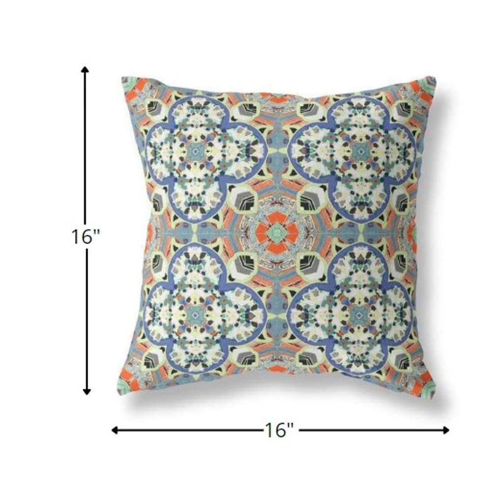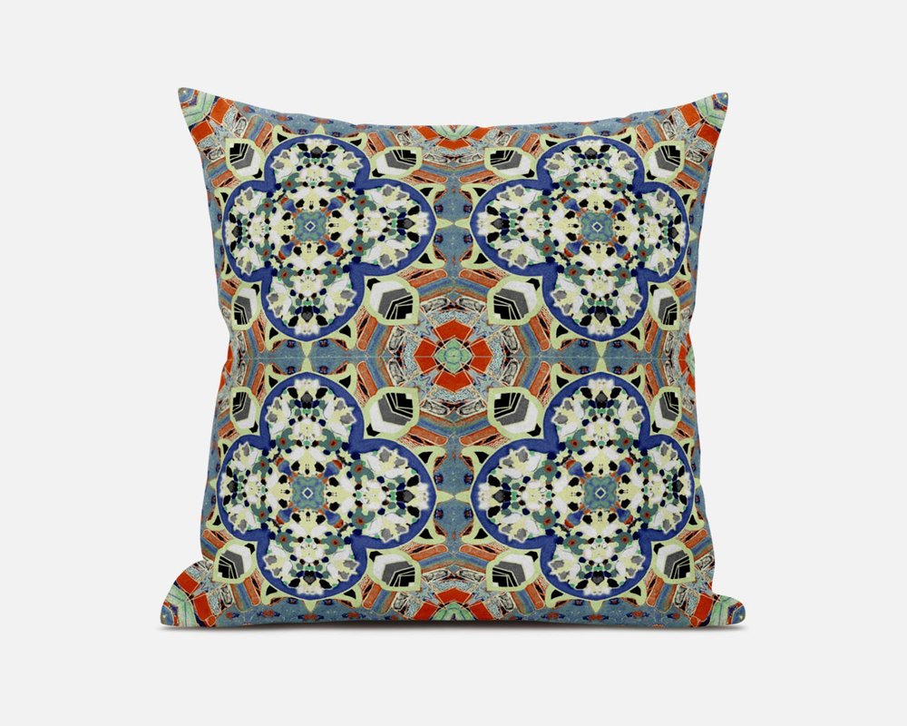 The recurrent pattern on this Blue Cream Cloverleaf Boho Suede Throw Pillow is the perfect accessory to a bohemian-style lounge or living room. The intricately designed cloverleaf patterns feature a fine fusion of soft blue and cream tones with pops of muted orange for a subtle yet eye-catching contrast. Draped in high-quality soft suede fabric for enhanced durability and a smooth finish with a lustrous sheen. This blown and closed pillow is filled with a durable polyfill insert for a cushiony feel with a fluffy nature, making it an ideal accent for your indoor settings. The exquisite patterns and alluring hues of this decorative pillow will be perfect to appeal to the eye of its beholder. 16” x 16” x 5”