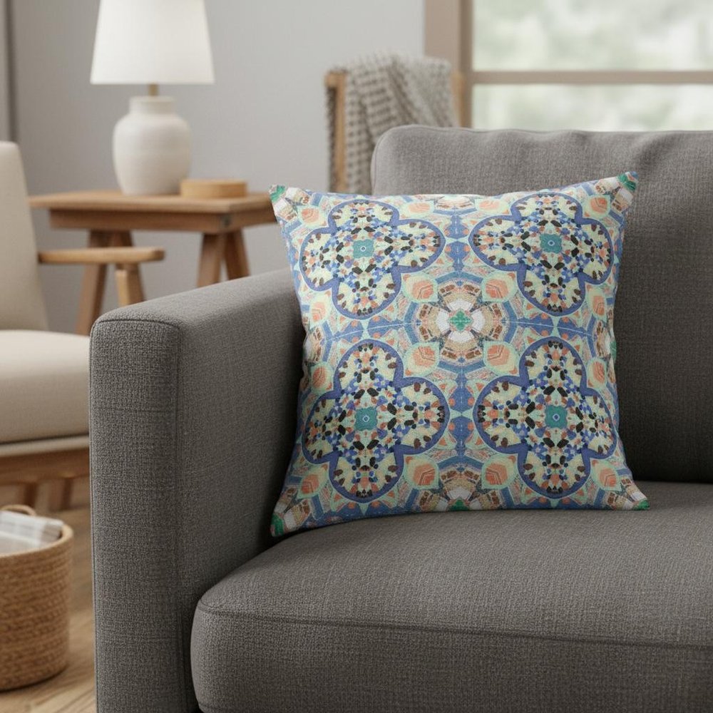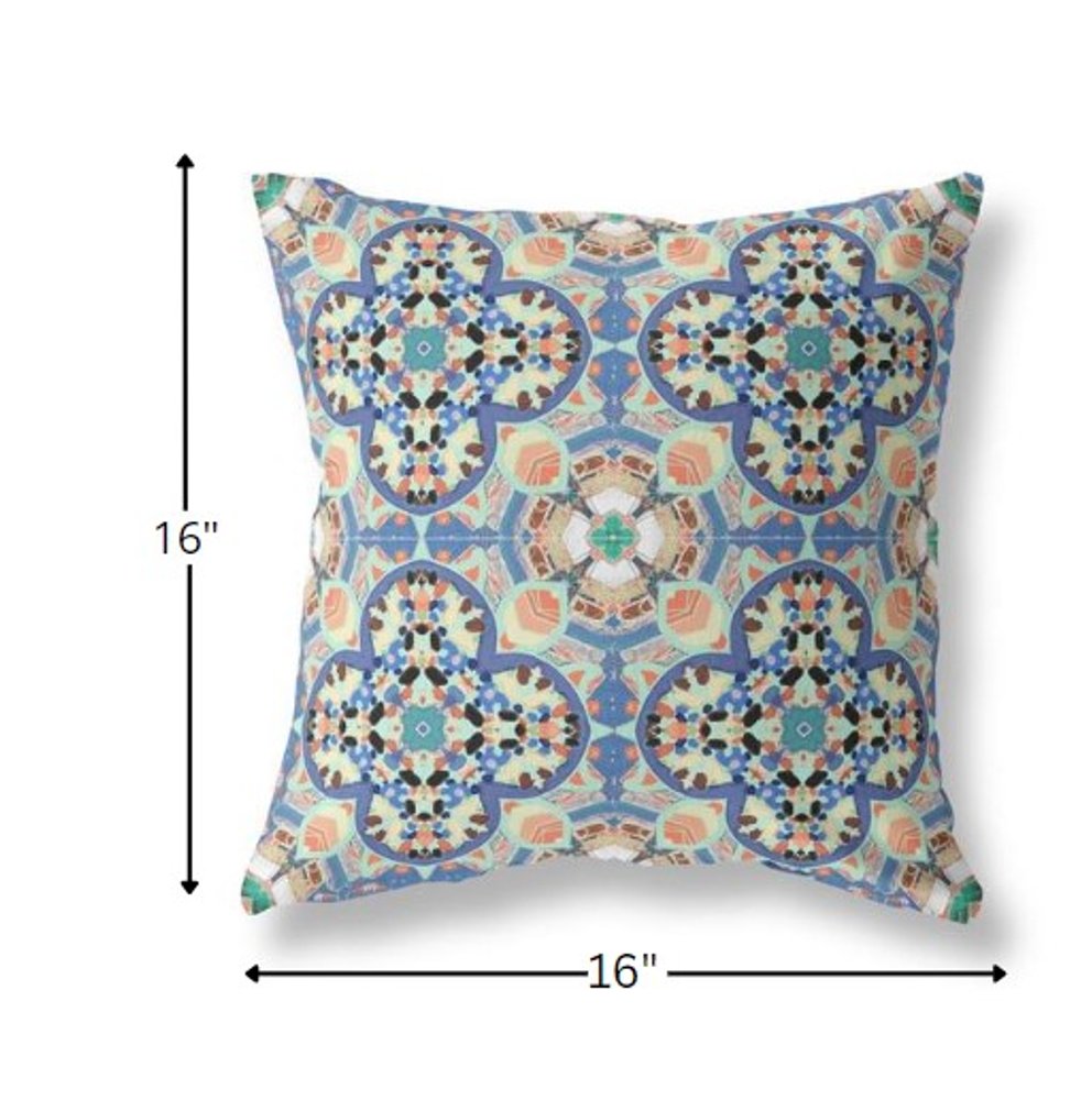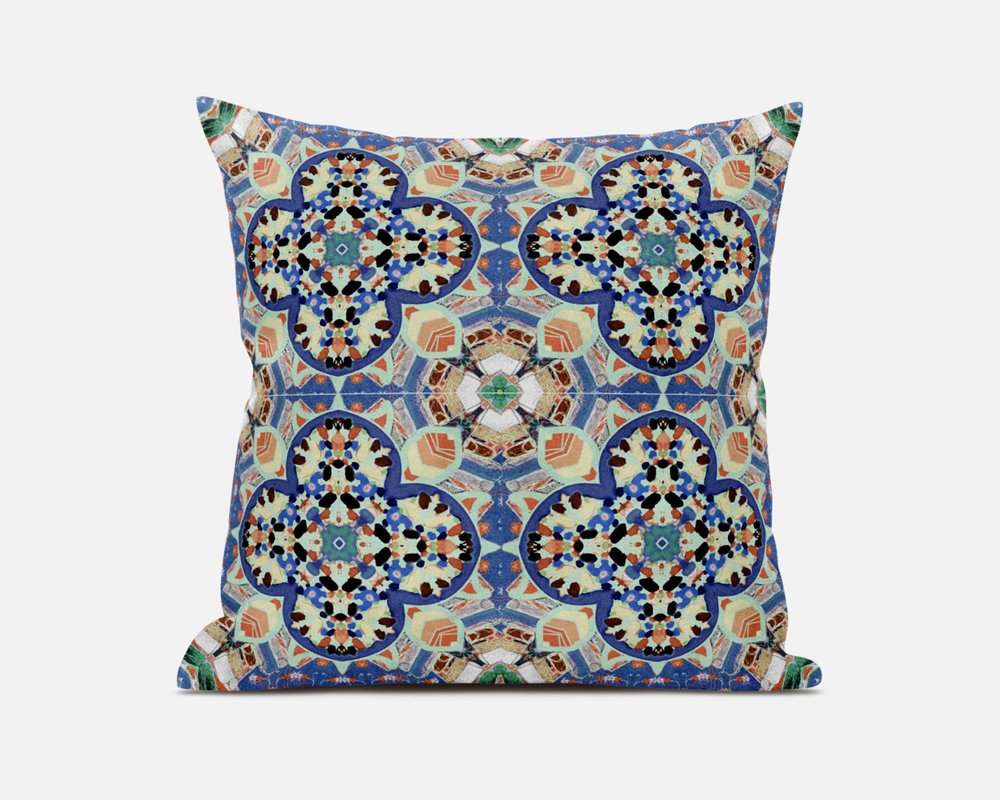 Bring the essence of boho into your living space with this gorgeous Blue Peach Cloverleaf Boho Suede Throw Pillow featuring peaceful shades of blue and aquamarine intermingling with a cheery peach. The geometric cloverleaf patterns in the contrasting cool and warm tones create visual harmony. Made from superior grade suede fabric for a durable structure and premium feel, it's the perfect accent for adding a velvety appeal to your indoor settings. This blown and closed pillow comes with a soft polyfill insert that gives this piece a plush and fluffy look for utmost comfort. Adorn your living space with the calming pop of colors on this throw pillow and feel the tranquility every time you brush your hand against its lush texture. 16” x 16” x 5”