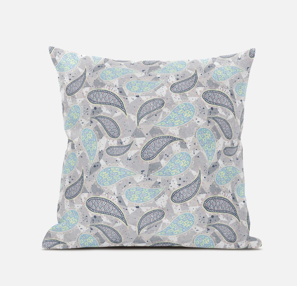 16” Gray Turquoise Boho Paisley Suede Throw Pillow