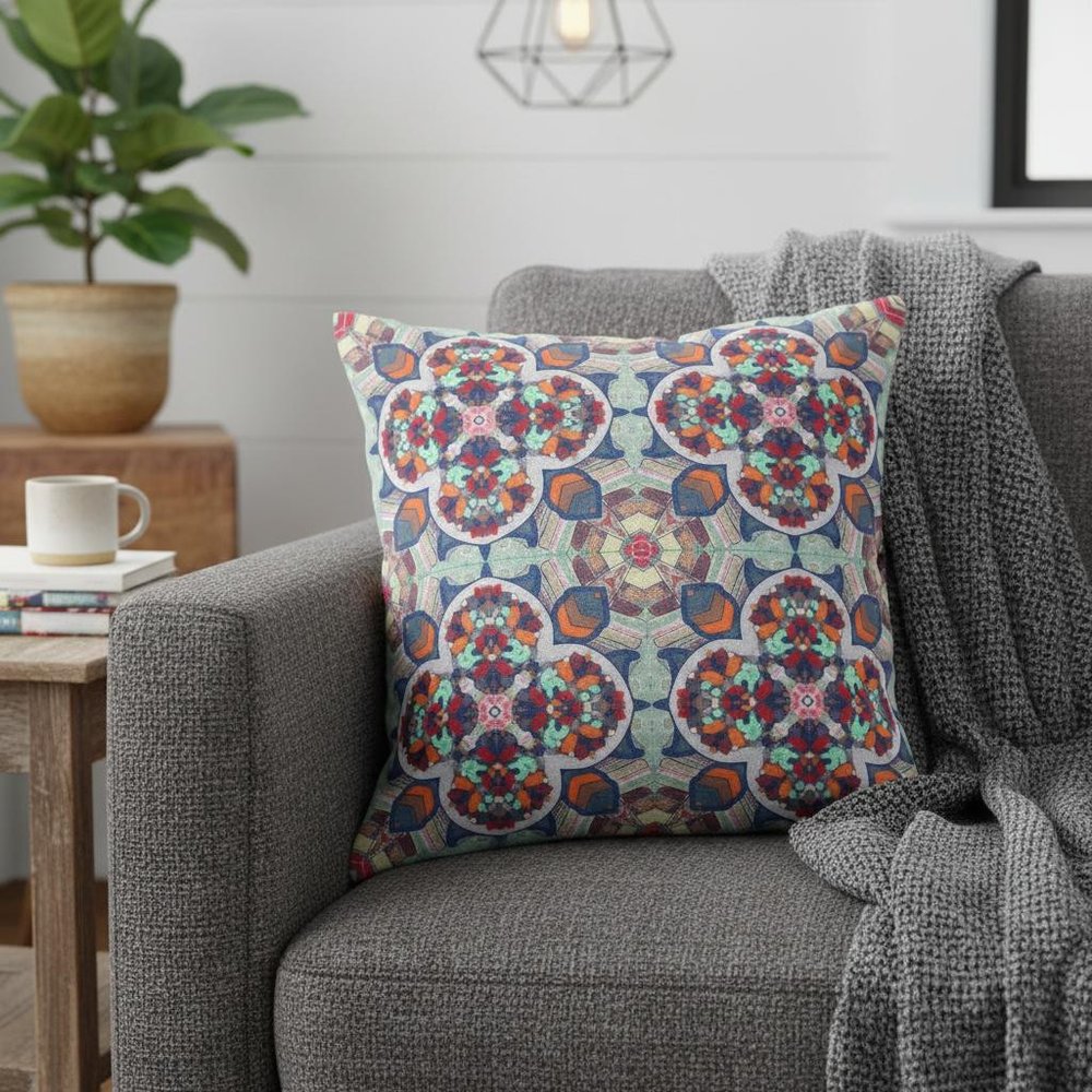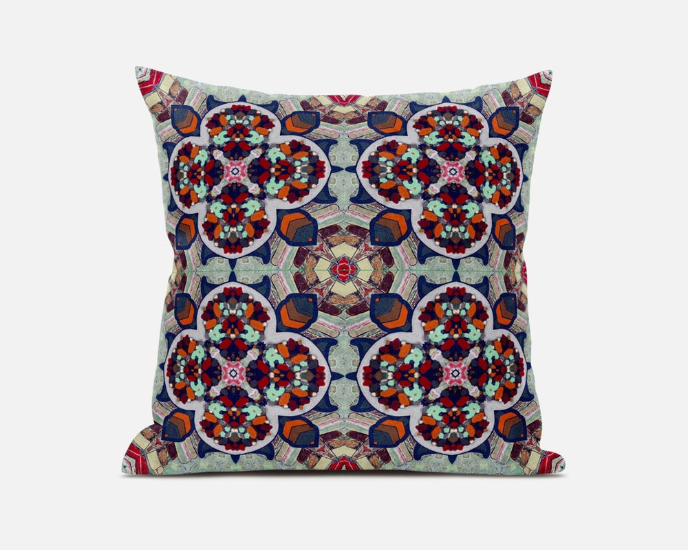 Lend a rich bohemian vibe into your living space with this beautifully designed Green Orange Cloverleaf Boho Suede Throw Pillow. Showing off a cloverleaf-like design pattern in muted green and blues with pops of orange and red hues to strike a balance between warm and cool tones. The smooth texture of the appealing suede fabric is sure to add a luxurious touch to the piece while making the pillow highly durable with a soft hand. This pillow is blown and closed with a sturdy yet soft polyfill insert for a plush and fluffy look while maximizing comfort every time you lean on it. Trendy yet traditional at the same time, this decorative throw pillow features a fusion of colors to spruce up your home. 16” x 16” x 5”
