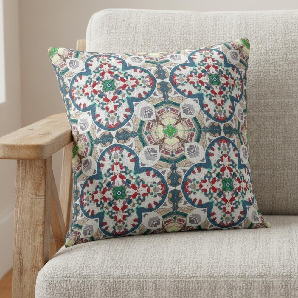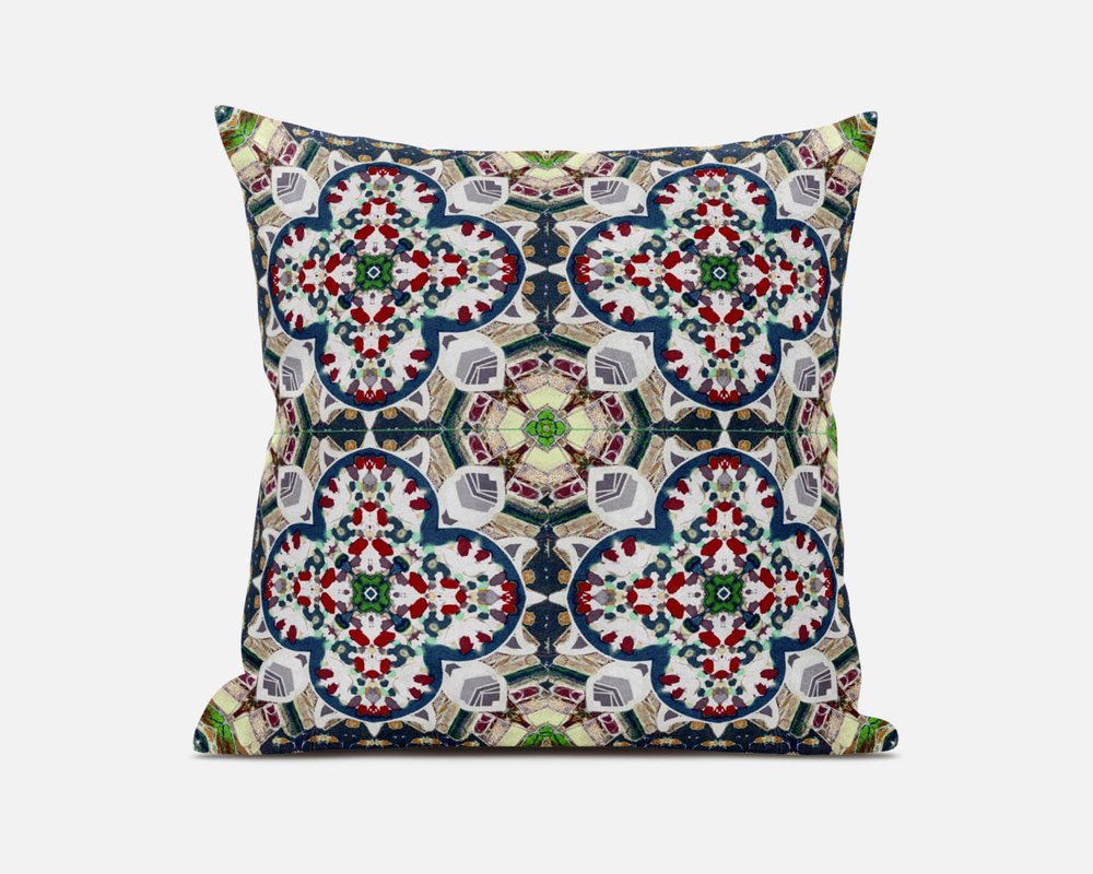 Delve into the concord of eye-catching hues in this Green White Cloverleaf Boho Suede Throw Pillow and bring life into your bohemian or contemporary living space. The geometric cloverleaf-like motifs of this bohemian style throw pillow in shades of green and white with the hints of red would harmonize flawlessly with any modern-day décor you have in your home. The elegant feel of the blown and closed pillow comes from the plush polyfill insert giving the piece a fluffy look. Crafted from a sturdy suede fabric, the pillow ensures durability with a soft and smooth texture, ideal for everyday use. Bohemian accents in a modern-contemporary style home are all the rage these days, and this exquisitely designed pillow offers the perfect marriage between the two styles to spruce up your home. 16” x 16” x 5”