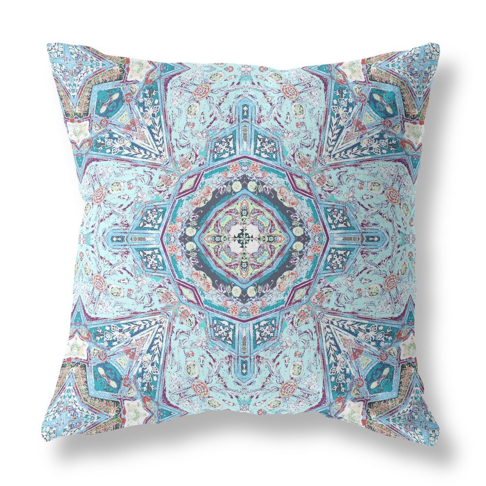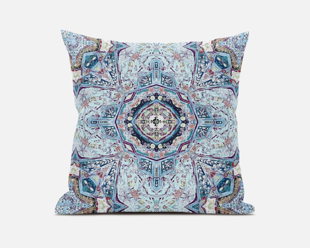 Bring a traditional boho-chic aesthetic to your house with this lovely Light Blue Boho Flower Suede throw Pillow that combines geometric and floral designs with modern linework. The soft-tone pastel palette elevates the details in the calming shades of blue and pink in the most appealing way to bring visual calm to the look. The cushion's high-quality digital print has been intended to last for years while retaining its color intensity. Crafted in the USA from superior quality suede fabric for sturdy construction to last long while the soft and smooth appearance adds to the beauty and comfort of your home. This throw pillow is blown and filled with a 100% polyester fiber filling insert, giving it a soft cushiony feel and a fluffy nature for optimal comfort. If you are looking for an eye-catching element to add to your home, this unique take on traditional motifs will suit any modern, contemporary, or bohemian setting. 16” x 16” x 5”
