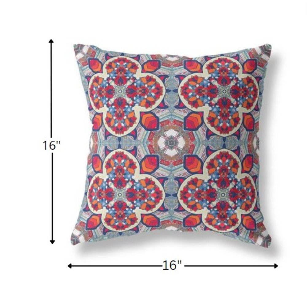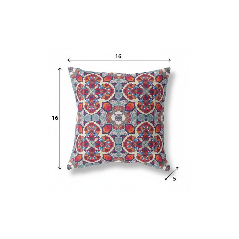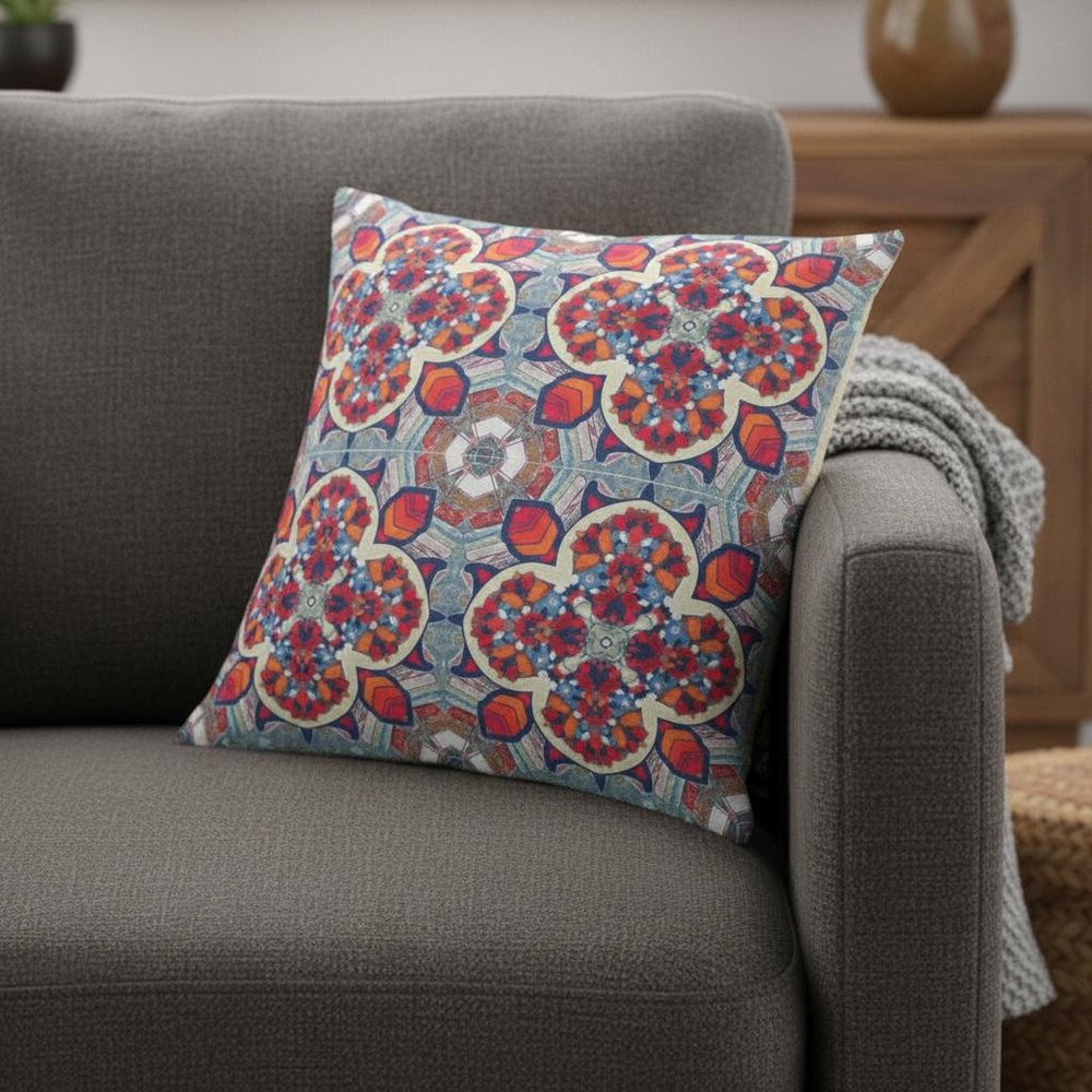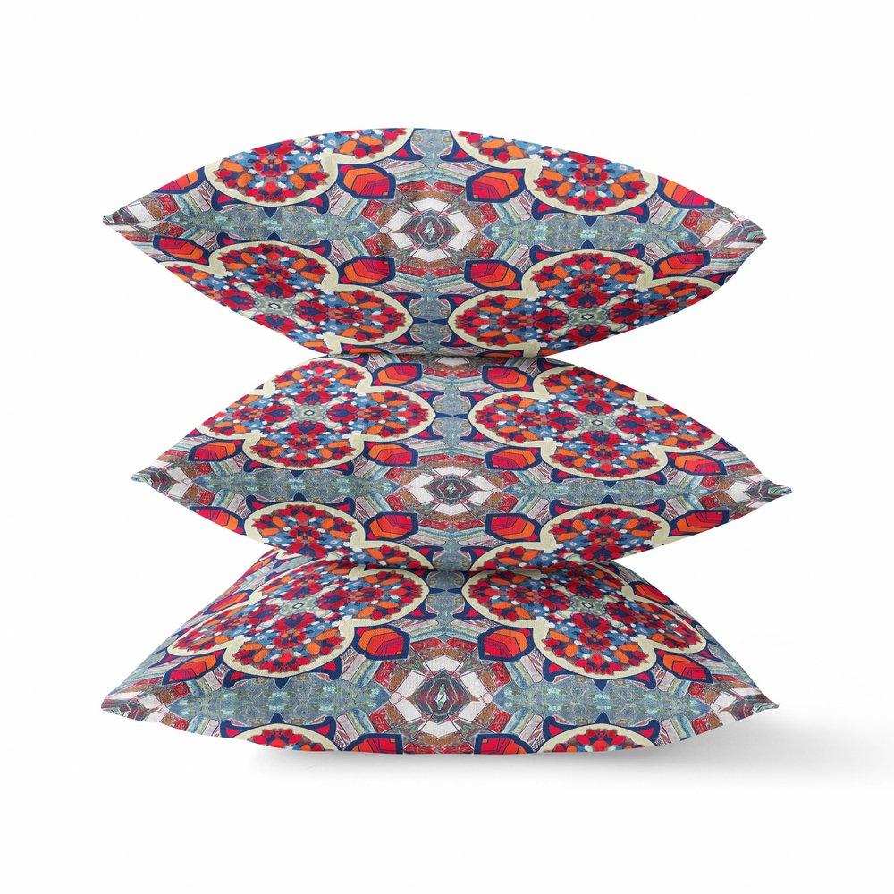 Give your home the gift of bohemian charm and modern elegance with this Red Blue Cloverleaf Boho Suede Throw Pillow that features an alluring palette to stand out even from a distance. Shadowing cloverleaf-like floral structures and geometric motifs in bright red, orange, soft blue, and white, this stunning pillow strikes a harmonious blend of cool and warm tones. The silky-smooth aesthetic of the suede fabric gives this pillow a luxurious and opulent look with a delicate drape while ensuring long-lasting durability to serve you for years. The plush look and fluffy nature come from the regular polyfill insert that provides a comfortable platform for your head and neck to maximize relaxation. Whether you pair this pillow with bold or neutral-themed decors, it will undoubtedly be an alluring accent to behold. 16” x 16” x 5”