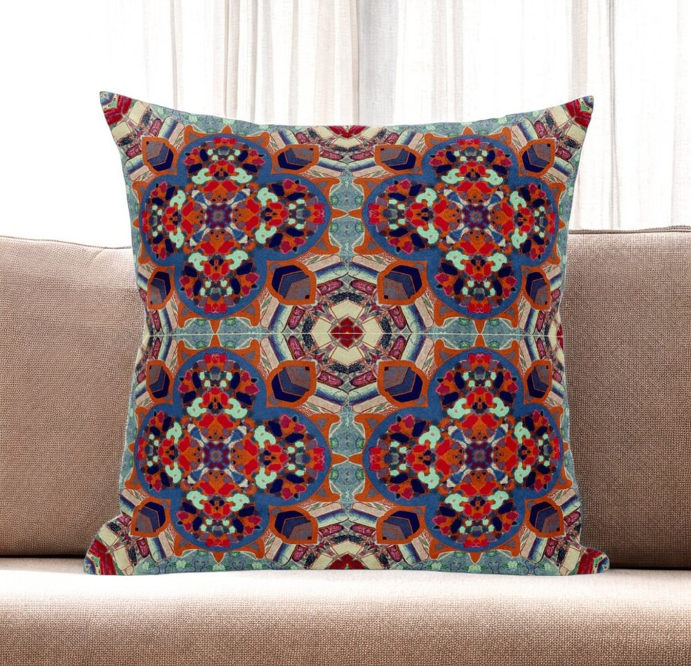 Bold and beautiful with its saturated hues, this Orange Blue Cloverleaf Boho Suede Throw Pillow is here to grace your modern living space with a bohemian charm. The mesmerizing medley of burnt orange, candy red, cobalt blue, and cyan creates alluring cloverleaf patterns that are meant to allure the gaze. The silky-smooth aesthetic of the suede fabric gives this pillow a luxurious and opulent look with a delicate drape while ensuring long-lasting durability to serve you for years. The soft and durable polyfill insert makes this pillow super fluffy and cuddly to let you experience utmost comfort when you hold it. Give your home a sense of warmth with a bohemian spirit as you flaunt this stunning multicolored decorative pillow on the couch. 18” x 18” x 5”