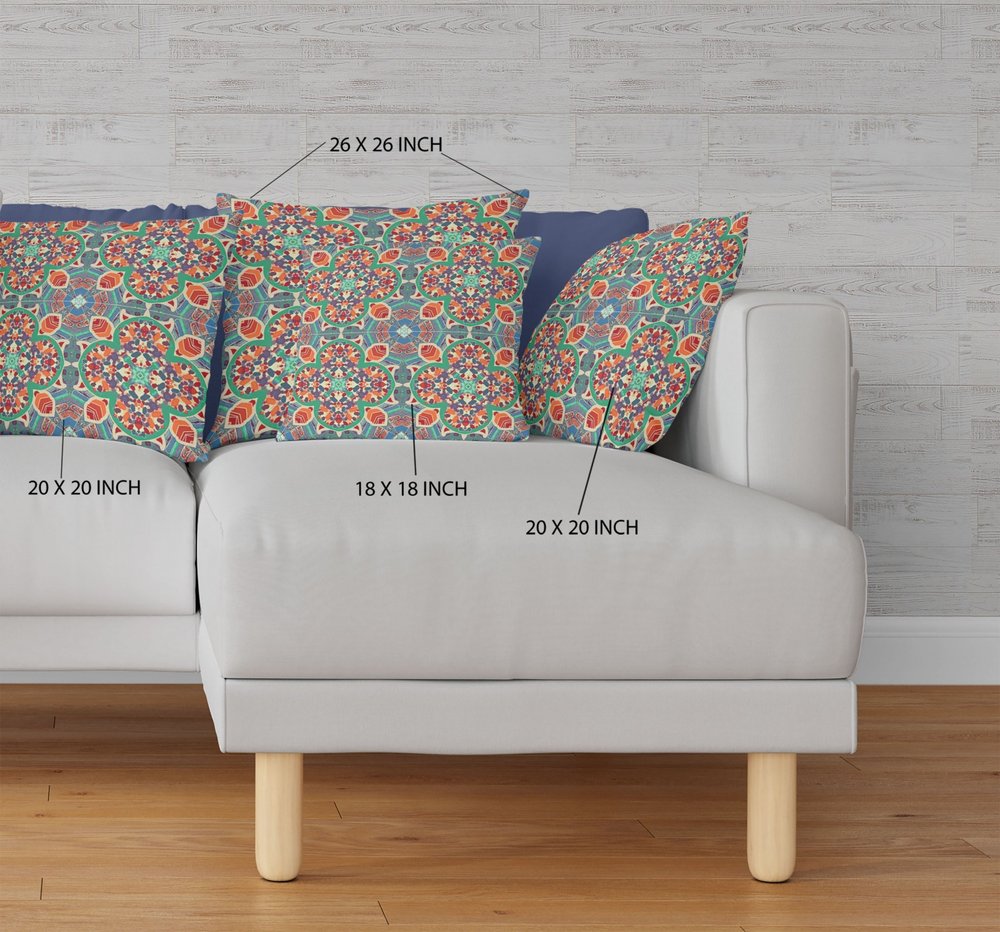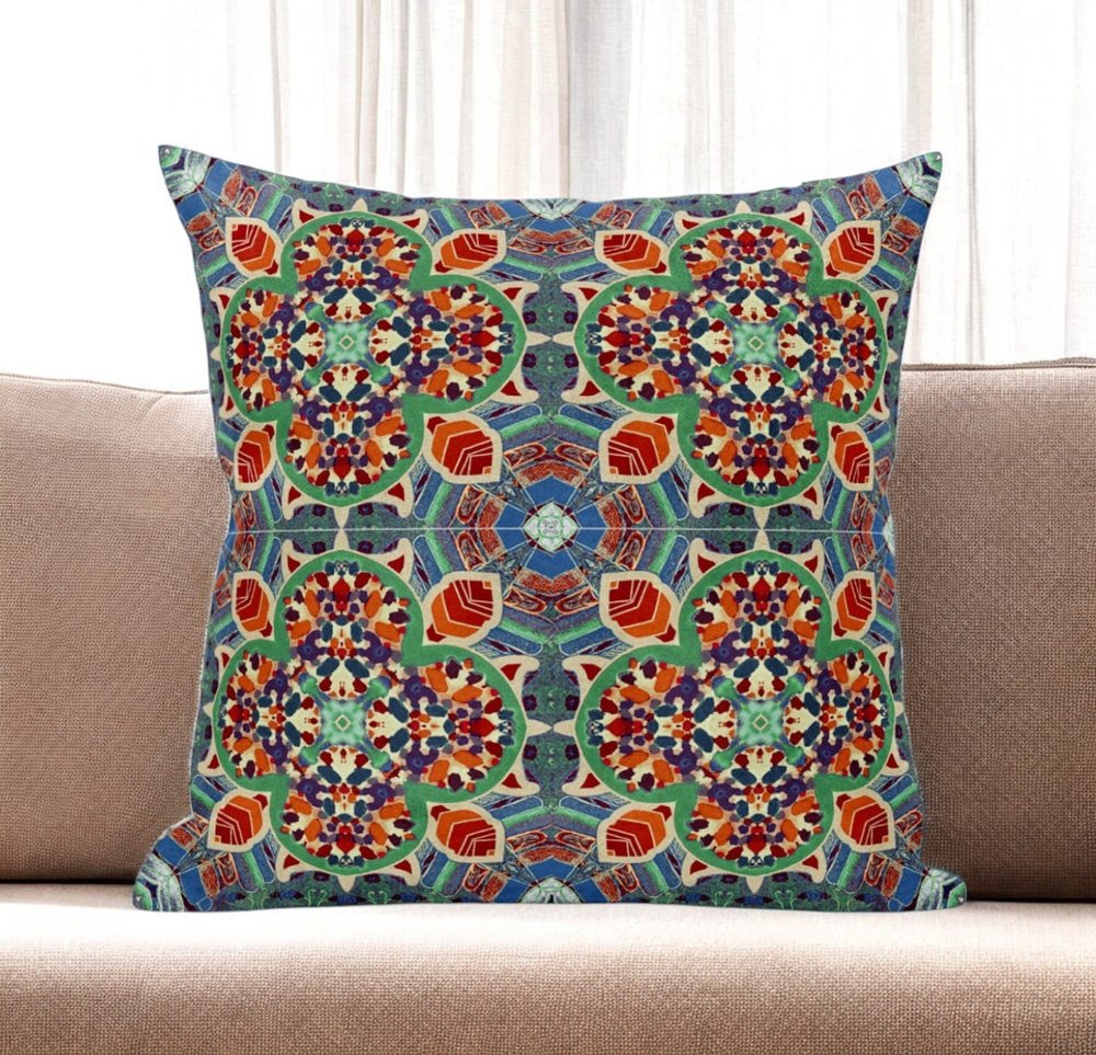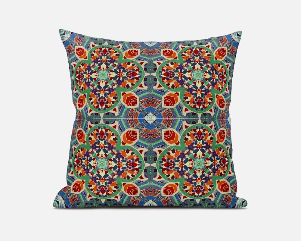 Enliven your living space with this stunning Orange Green Cloverleaf Boho Suede Throw Pillow that features a palette of colorful hues to bring a bohemian essence to your home. The intriguing cloverleaf-like patterns exhibit vibrant shades of warm reds and oranges with cool blue and jade tones to strike a perfect balance. This blown pillow is crafted from premium-quality suede fabric which is characterized by its soft and smooth surface texture for a delicate feel. The plush look and fluffy nature come from the regular polyfill insert that provides a comfortable platform for your head and neck to maximize relaxation. Make your living space look and feel more welcoming with this beautiful decorative pillow that’s meant to add colors to your interior décor. 18” x 18” x 5”
