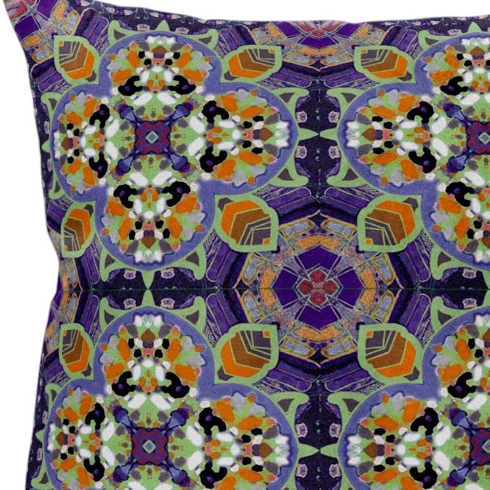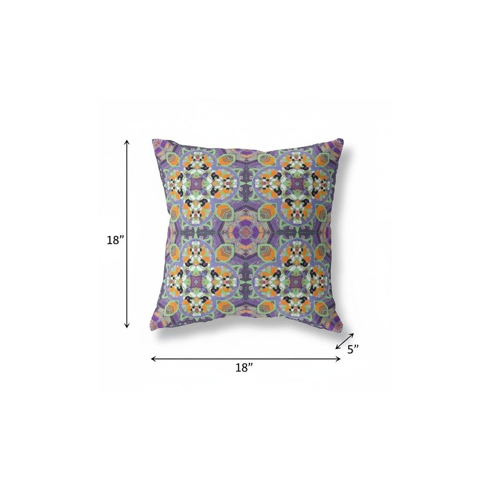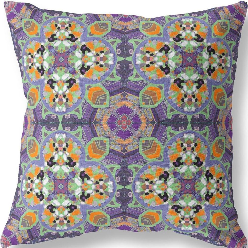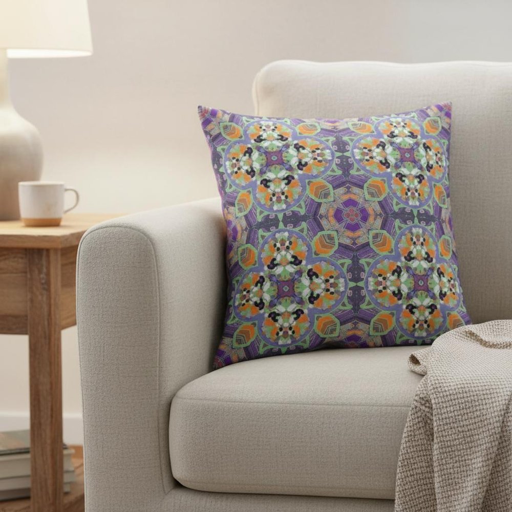 Let the contrasting hues of this Purple Orange Cloverleaf Boho Suede Throw Pillow enliven your living space with a sense of warmth and vibrance. The gorgeous purple-toned background is teeming with intricate cloverleaf and geometric patterns featuring pastel green and bright orange shades for visual interest. Crafted from a sturdy suede fabric, the pillow ensures durability with a soft and smooth texture, ideal for everyday use. The soft and cushiony feel comes from the high-quality polyfill insert that adds to the fluffy look while ensuring maximum comfort for relaxation. A piece of art on its own, this colorful throw pillow is sure to spruce up any modern or bohemian home. 20” x 20” x 5”