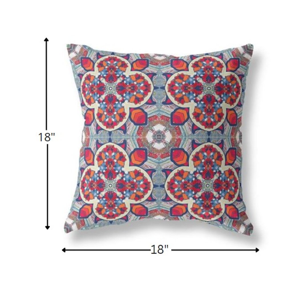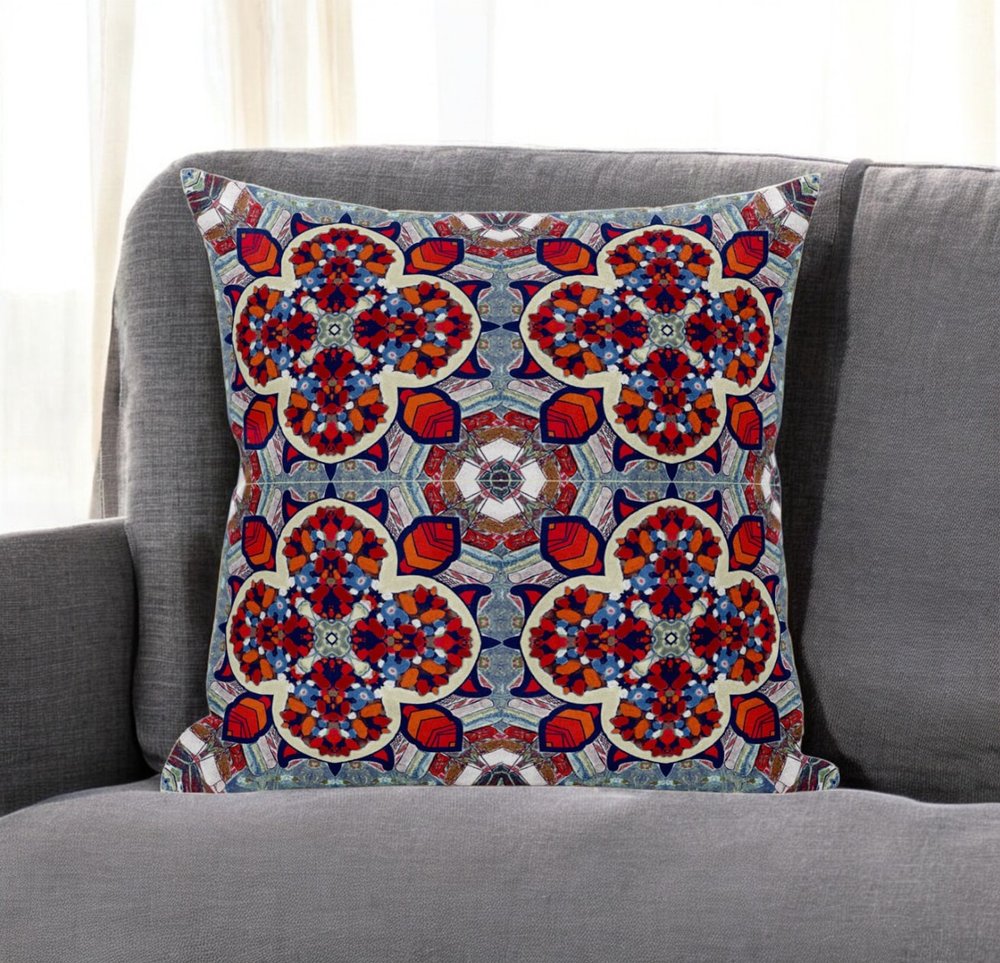 Give your home the gift of bohemian charm and modern elegance with this Red Blue Cloverleaf Boho Suede Throw Pillow that features an alluring palette to stand out even from a distance. Shadowing cloverleaf-like floral structures and geometric motifs in bright red, orange, soft blue, and white, this stunning pillow strikes a harmonious blend of cool and warm tones. The silky-smooth aesthetic of the suede fabric gives this pillow a luxurious and opulent look with a delicate drape while ensuring long-lasting durability to serve you for years. The plush look and fluffy nature come from the regular polyfill insert that provides a comfortable platform for your head and neck to maximize relaxation. Whether you pair this pillow with bold or neutral-themed decors, it will undoubtedly be an alluring accent to behold. 18” x 18” x 5”
