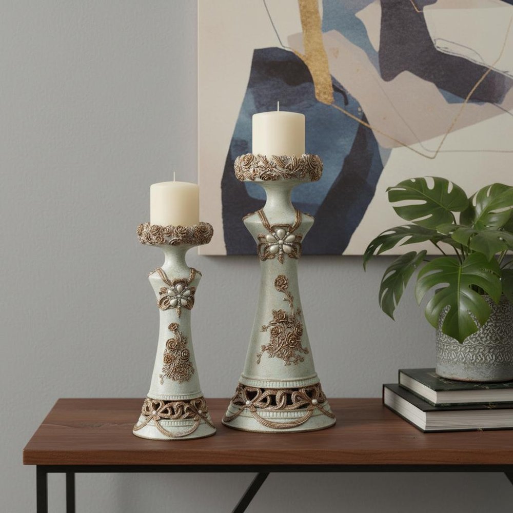 Create a warm and inviting environment in any space with this set of 2 beige and brown vintage pillar tabletop candle holders. Ships with candles included for added value and ease of use. Dress up your home to impress every season with this fabulous romantic vintage styled candleholder. Decorated with faux crystals and faux pearls. Candleholders are a decorative accent on their own. They are also an attractive way to turn a simple candle into a piece of décor on its own. 16" H x 7" W x 7" D