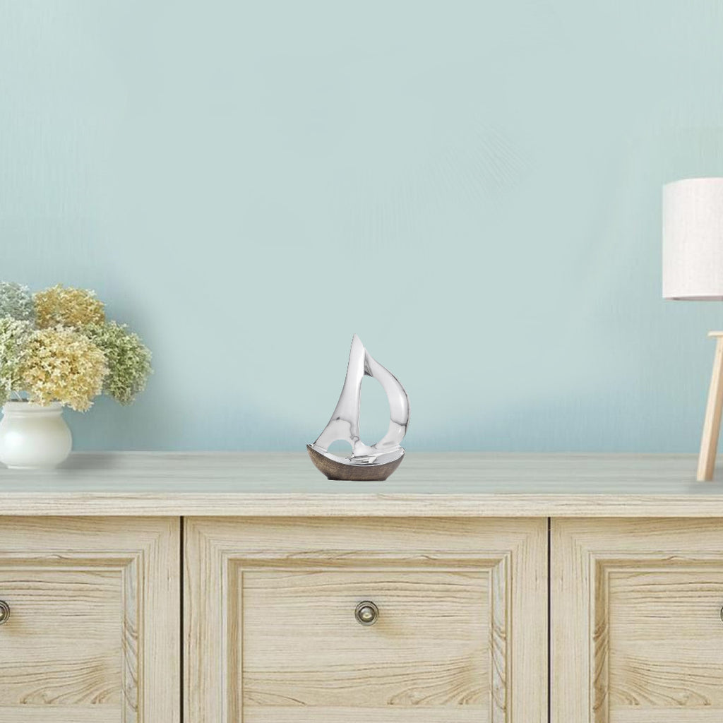 Crafted in sleek buffed aluminum, this modern tabletop sculpture in elegant brown and silver tones adds a modern nautical touch to your decor. The high-quality construction showcases expert artistry for a refined aesthetic that effortlessly complements any interior. Enhance your space by displaying this versatile piece solo or alongside other decorative accents, creating a cohesive and stylish ambiance that exudes contemporary charm. 12-inch H x 4-inch W x 8-inch D