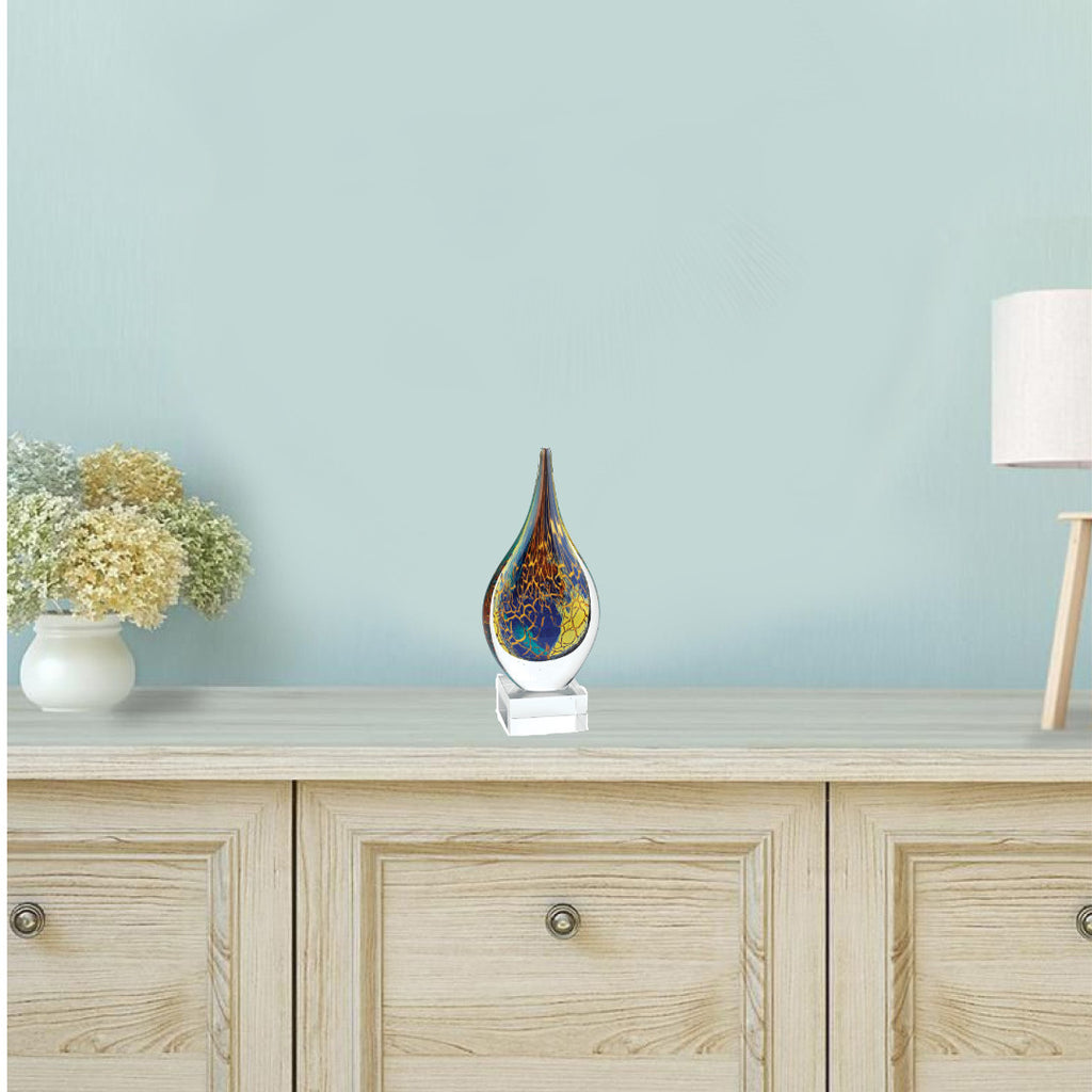 The 13-inch blue and yellow murano glass modern abstract tabletop sculpture is the perfect decorative accessory for your home. This blue and yellow hued piece represents high quality, expertly made from high grade murano glass. It's a perfect addition for those who love an up-to-the-minute look and feel. 13-inch H x 3-inch W x 6-inch D