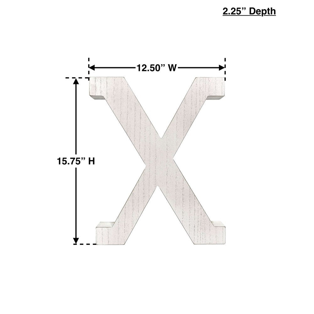 Add some personalization to your space with this Distressed White Wash Wooden Initial Letter Sculpture. Large in size, the 15.75"h letter can be a great accent to your living room, kitchen, entrance foyer, children's bedroom and more. Use to spell out a monogram or create a word to add some creative and special decor to your room. Crafted from MDF in a natural rustic and distressed white finish, the letter can be used as is, re-painted a different color, or stained, making it a fun option for a DIY craft project. Comes ready to hang but is also designed to be free standing to sit on a table, ledge, mantel, dresser, desk or bookshelf. 15.8" x 12.5" x 2.3"