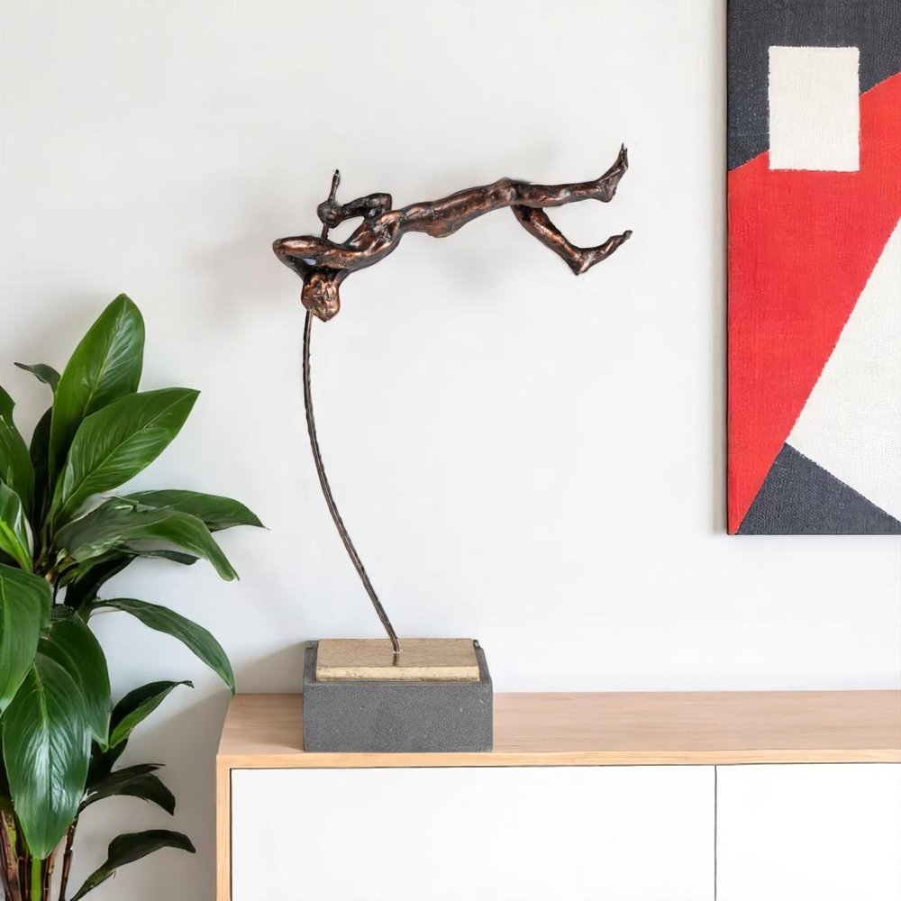 The 17-inch bronze resin dance man tabletop sculpture is the perfect decorative accessory for your home. A perfect decorative addition for anyone who loves a stylish look and feel. This captivating piece embodies the art of movement, showcasing a pole vaulter mid-leap for an eye-catching visual appeal. Crafted with precision from resin with antiqued bronze metallic detailing. Perfect for those who appreciate the fusion of artistry and athleticism, this sculpture is a statement piece for any space. 17-inch h x 9.5-inch w x 3.5-inch d.
