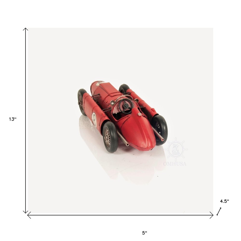 An authentic piece of Formula One history, the 1954 Lancia D50 Sculpture is a unique handmade replica of Alberto Ascari's D50. Handmade out of metal and authentically hand-painted, this replica includes amazing detailing like rolling wheels, a seat, and a steering wheel. A must-have for Formula One enthusiasts and collectors. 4.5'' x 13'' x 5"