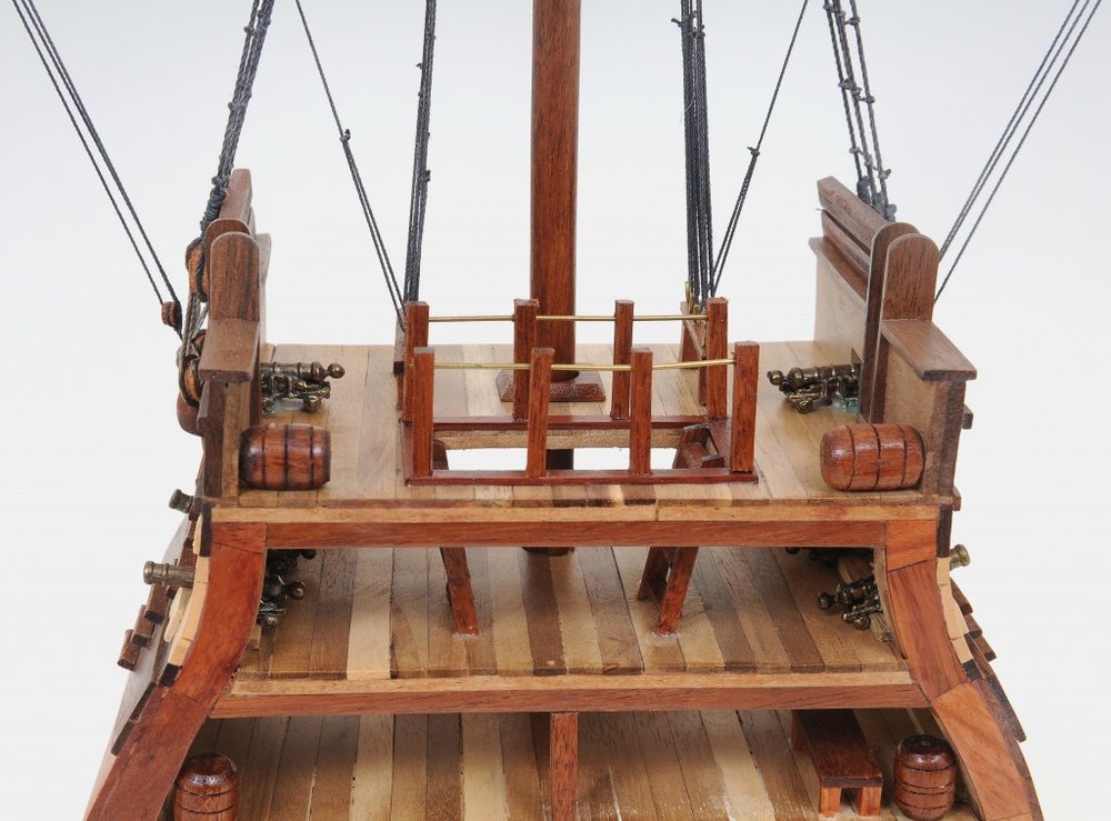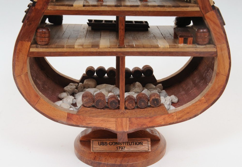 Magnificent and incredibly detailed replica, the 1797 USS Constitution Cross Section Model is a unique hand-built model of the famous American heavy frigate. Handmade by the most talented craftsman using high-quality western red cedar, rosewood, and mahogany. It features the cross-section of the ship, displaying the hull, metal canons, water barrels, a skylight, and many more intricate details. It comes with a solid wood base and a brass nameplate making it perfect for displaying. It is a sought-after piece for any history or maritime enthusiast. 34'' x 12.5'' x 3.75"
