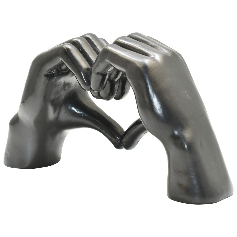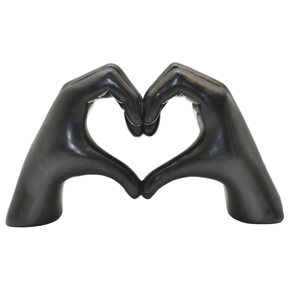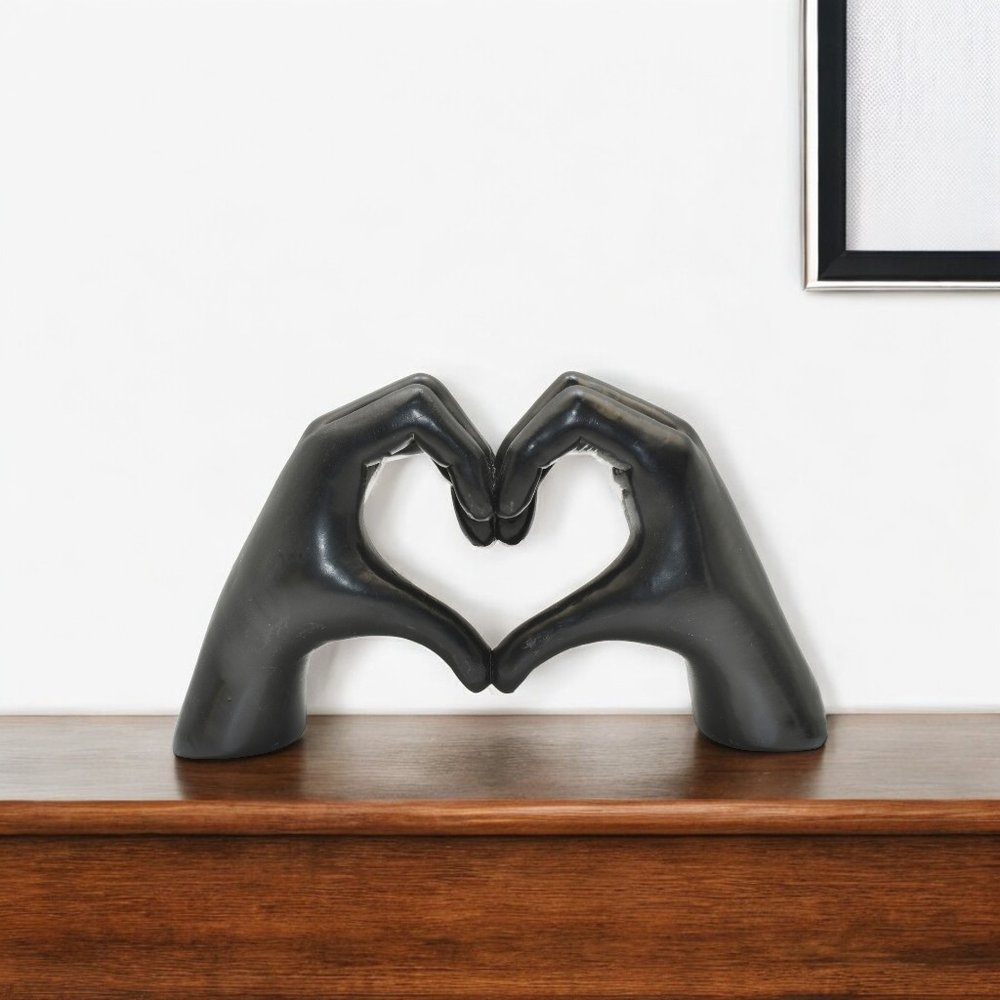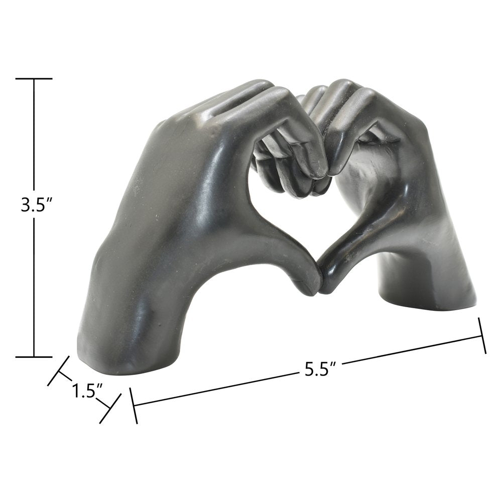 Add an air of fashion to your room and rejuvenate the space with this 4-inch black resin heart hands tabletop sculpture. This machine-made resin masterpiece combines a unique design with a transitional style that effortlessly enhances any decor. Crafted from durable resin, it showcases intricate details that capture the essence of human connection. A unique conversation starting tabletop sculpture, this piece will add a touch of romantic whimsy to your space with the adjoining hands and fingers that create a heart. 3.5-inch h x 5.5-inch w x 1.5-inch d.