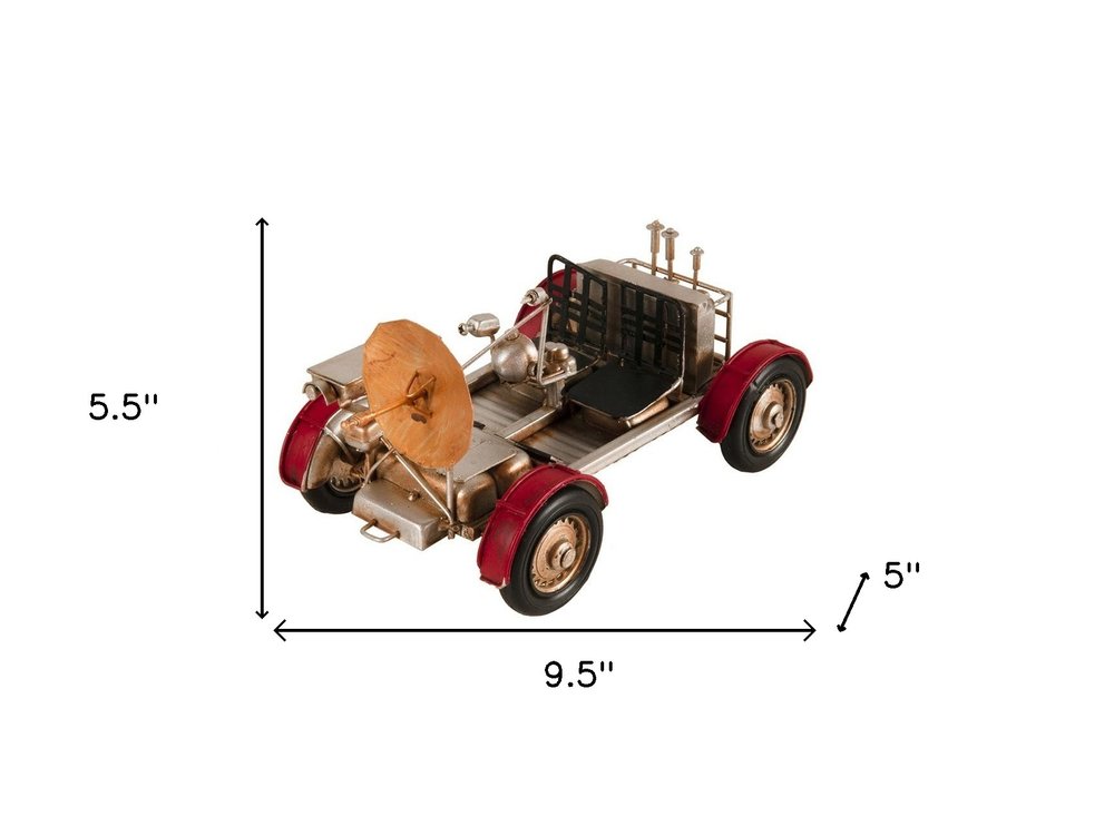 This hand-painted, handmade sculpture of a model car exudes traditional style with its captivating red and silver coloration. Crafted from high-grade metal, this decorative accent is an ideal addition to your living room, adding a touch of transportation-themed charm to your space. Perfect for those seeking a contemporary aesthetic, this sculpture is sure to elevate the look and feel of your home with its up-to-the-minute design. 5-inch h x 9.5-inch w x 5.5-inch d.