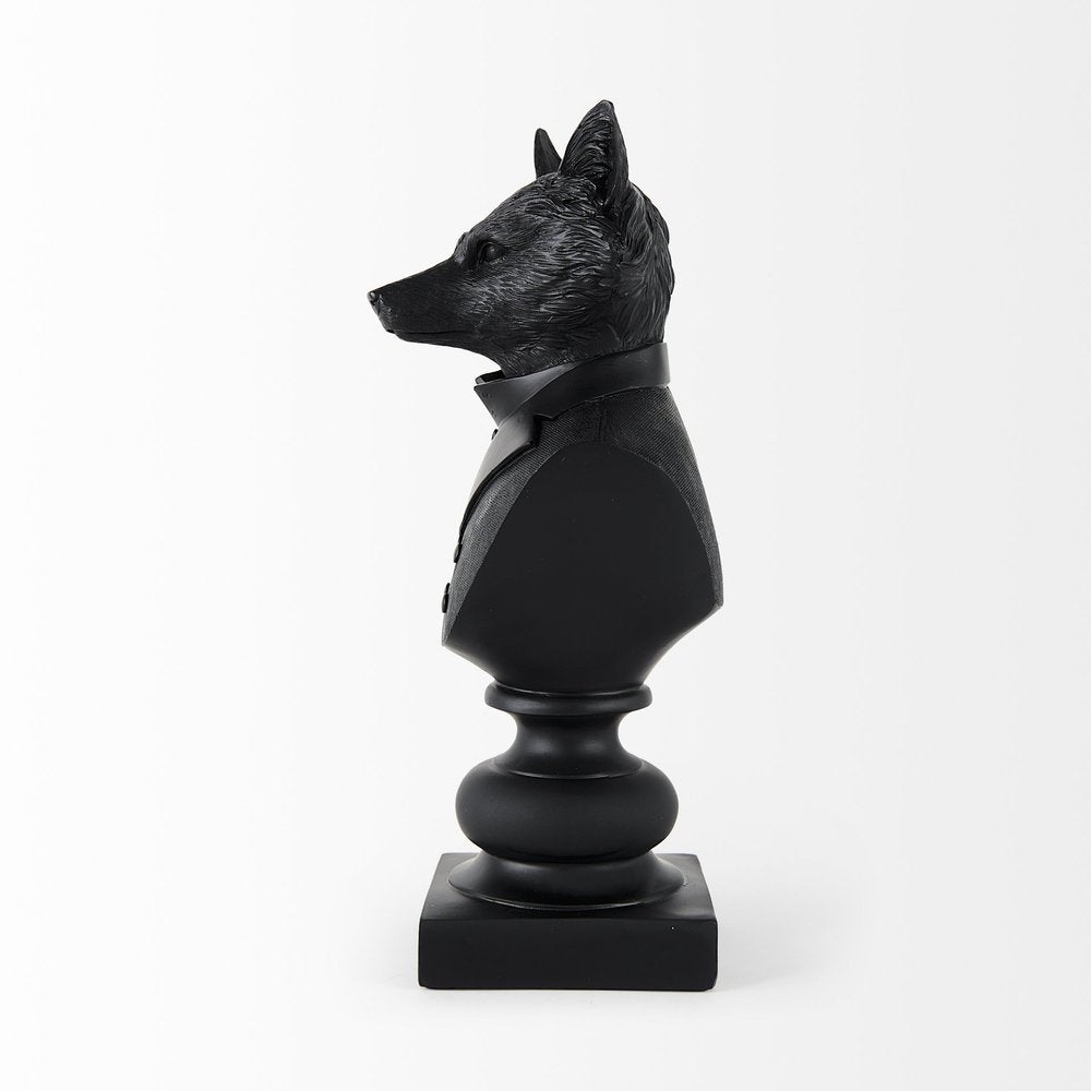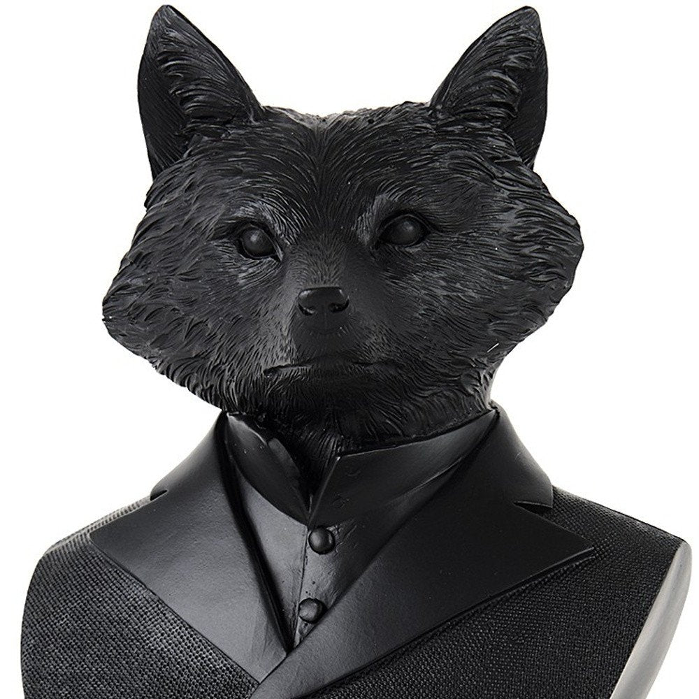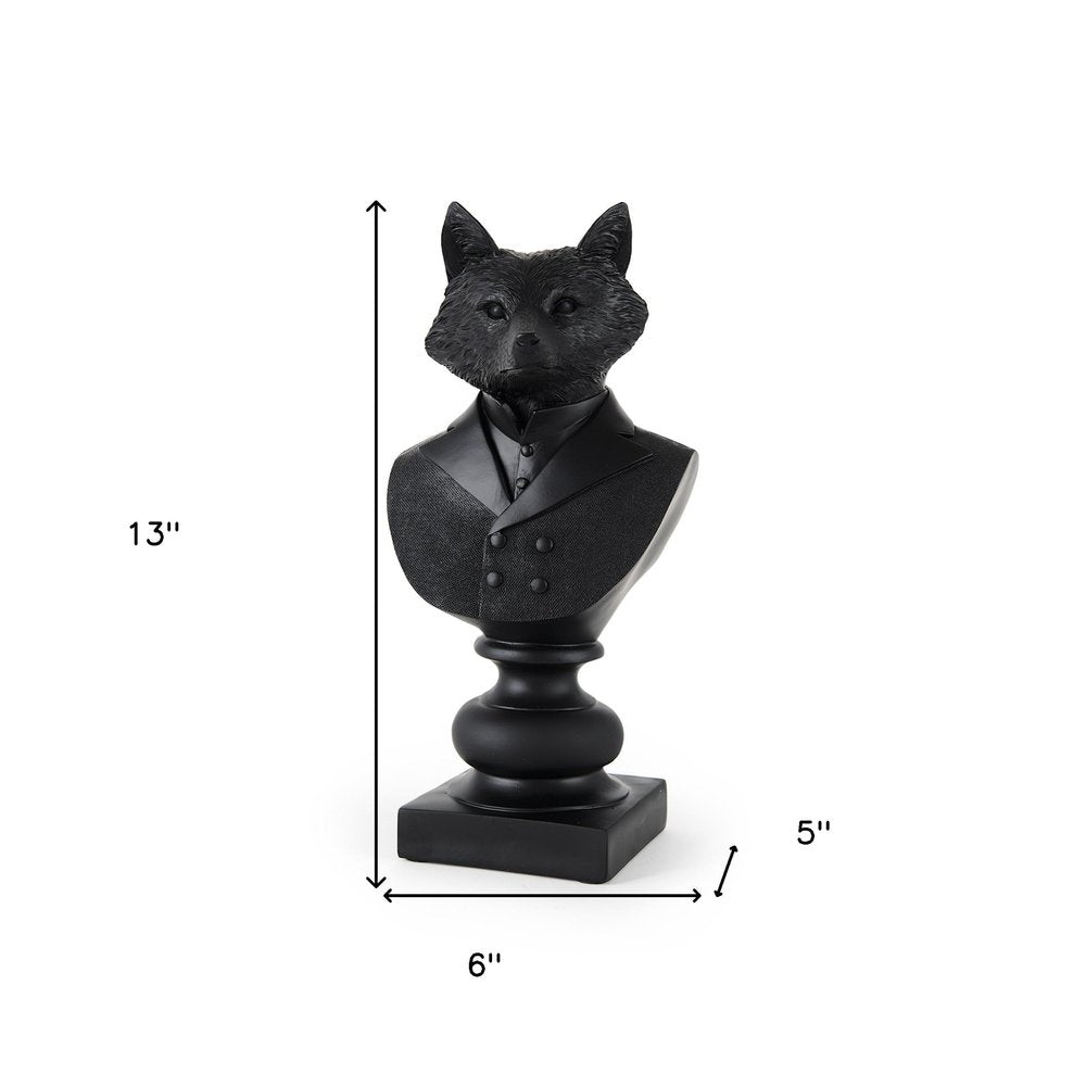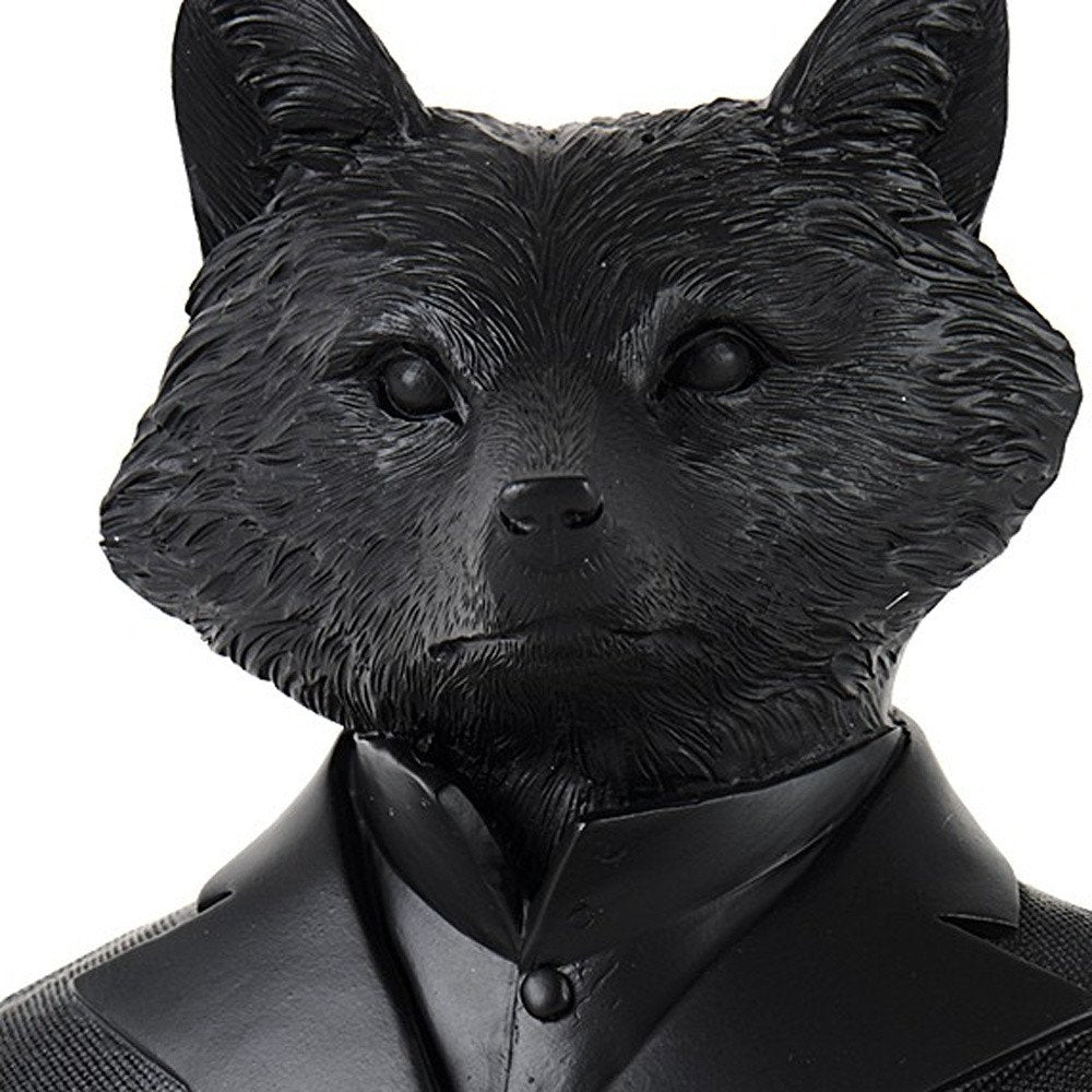 Add the perfect touch of whimsical design to your home with this Black Resin Suited Fox Bust Decor Piece. This sculpture is made from resin and has a matte black finish on it. The base of this piece has a graduated goblet handle shape sitting on top of a square base which flows in to the fox bust. The suited body is very detailed and shows off the lapel and the buttons perfectly. The fox head also has details in it that bring the whole piece together and add depth and dimension to the look of this whole piece. While this piece leans more whimsical, the neutral color makes it suitable for formal decor as well. 13" H x 5" W x 6" D