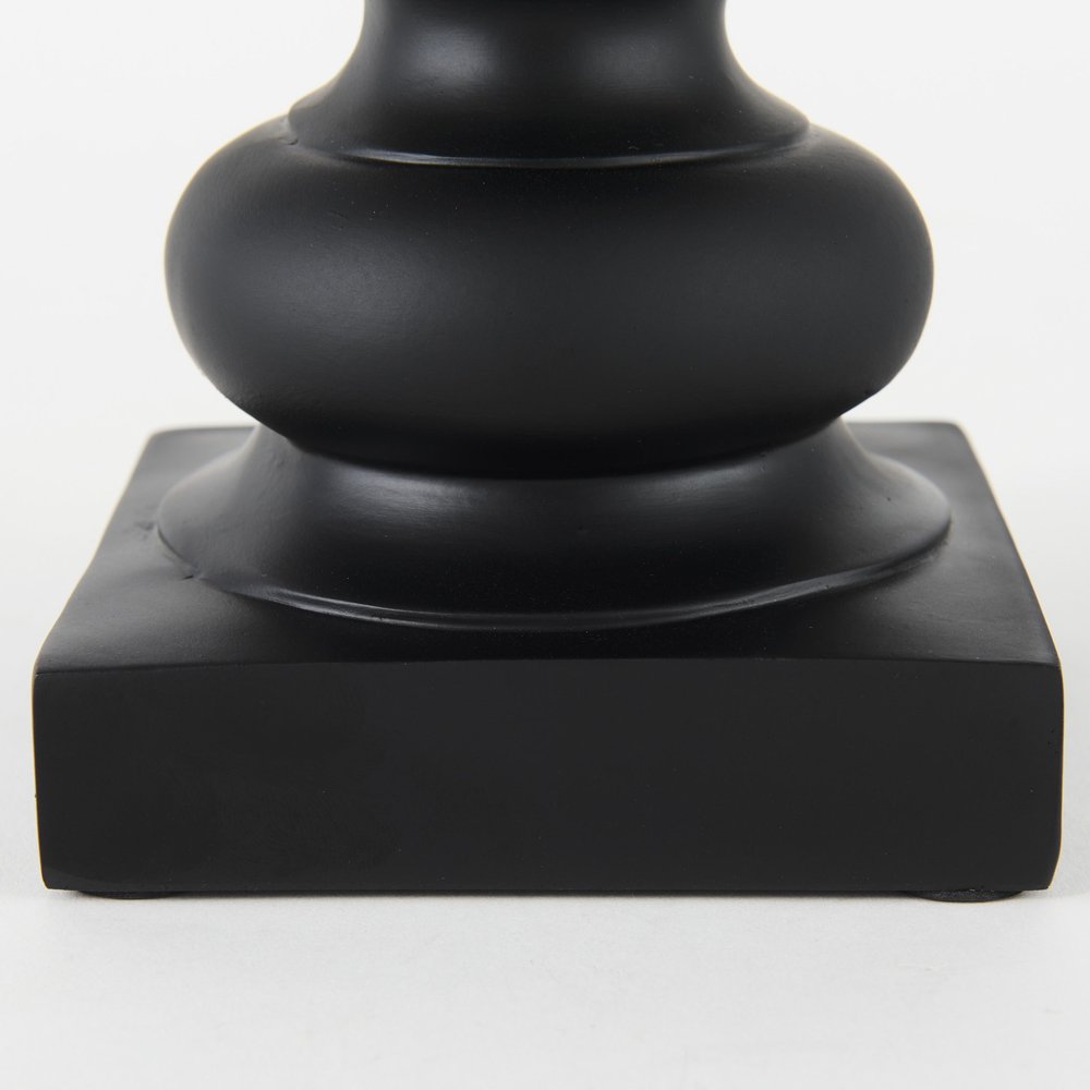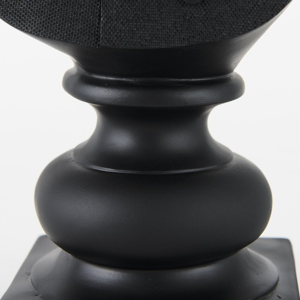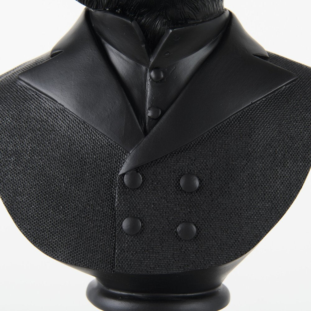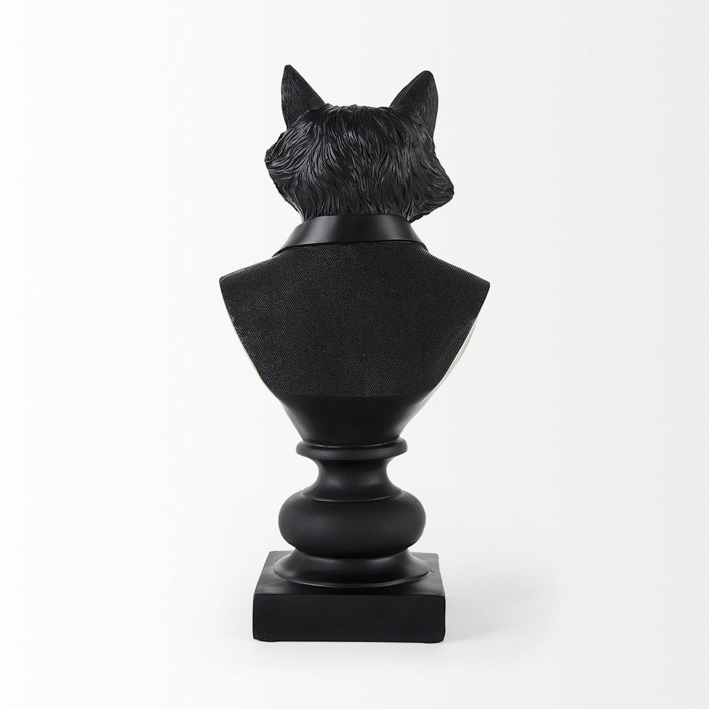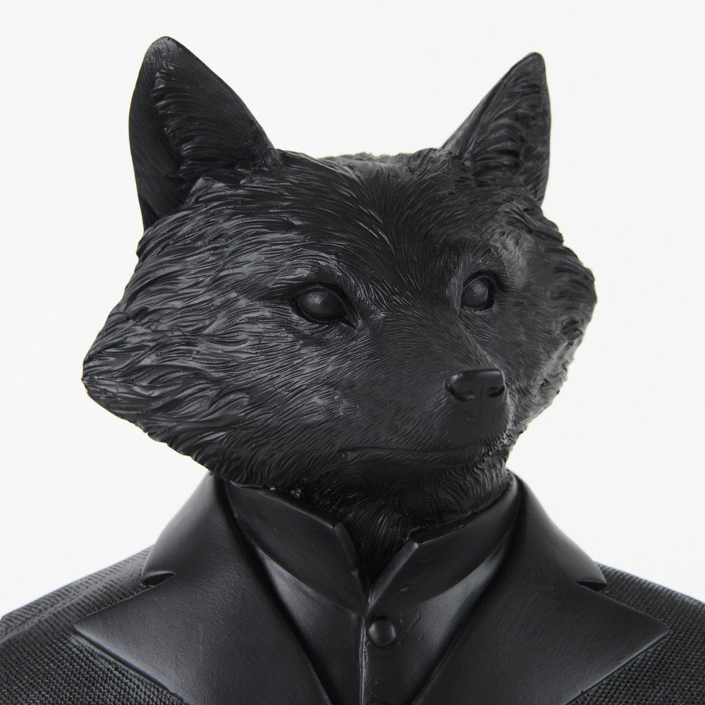 Add the perfect touch of whimsical design to your home with this Black Resin Suited Fox Bust Decor Piece. This sculpture is made from resin and has a matte black finish on it. The base of this piece has a graduated goblet handle shape sitting on top of a square base which flows in to the fox bust. The suited body is very detailed and shows off the lapel and the buttons perfectly. The fox head also has details in it that bring the whole piece together and add depth and dimension to the look of this whole piece. While this piece leans more whimsical, the neutral color makes it suitable for formal decor as well. 13" H x 5" W x 6" D