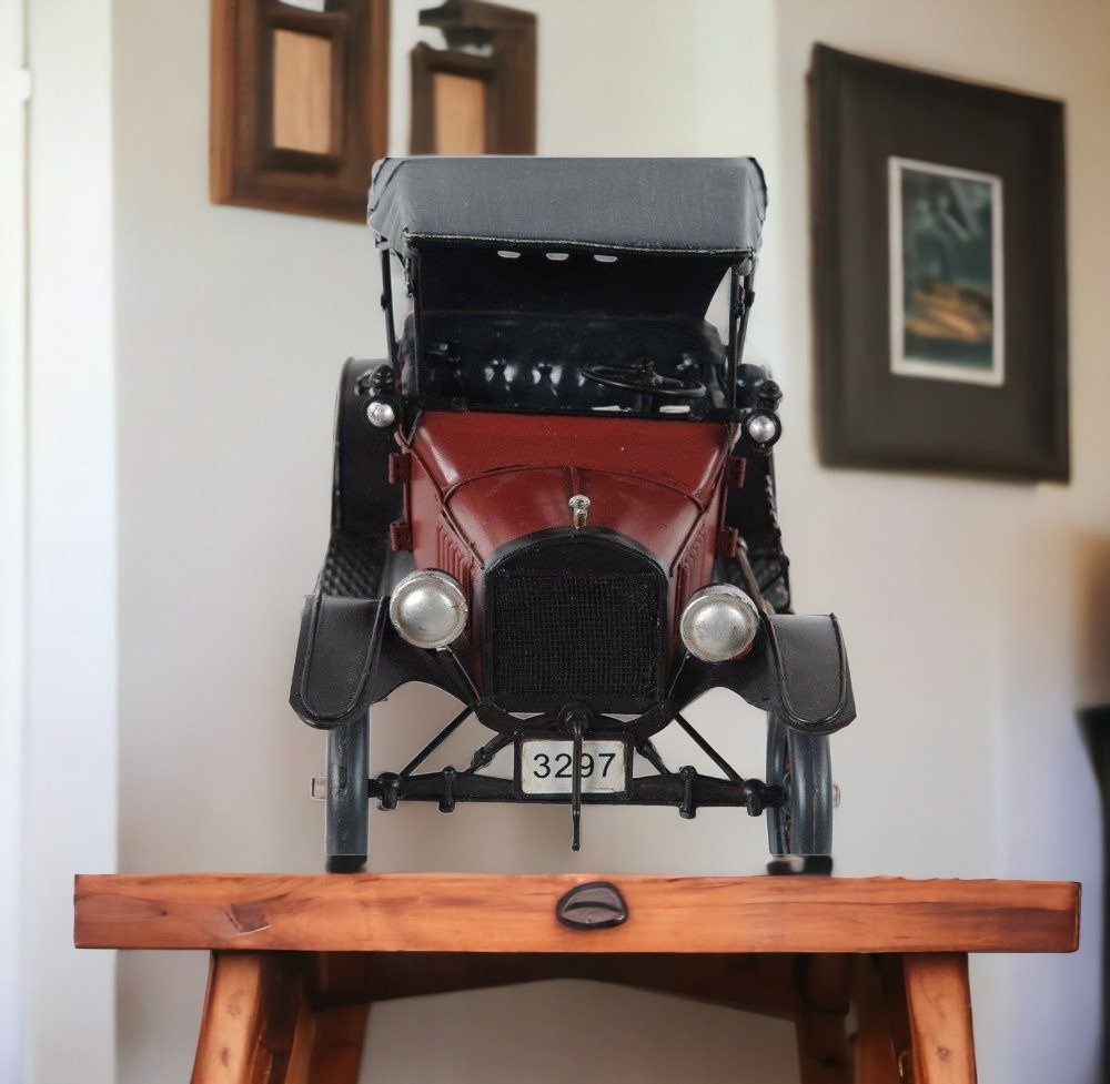 Add some striking desk or shelf décor to your space with this c1924 Red Ford Model T Car Sculpture. This Model T replica is a antiqued red color while the rolling wheel spokes are orange, giving this sculpture a decorative twist. With a scale of 1:12, this cool orignal car replica is designed to be enjoyed by car enthusiasts and Ford history buffs. 7" x 11.5" x 5.5