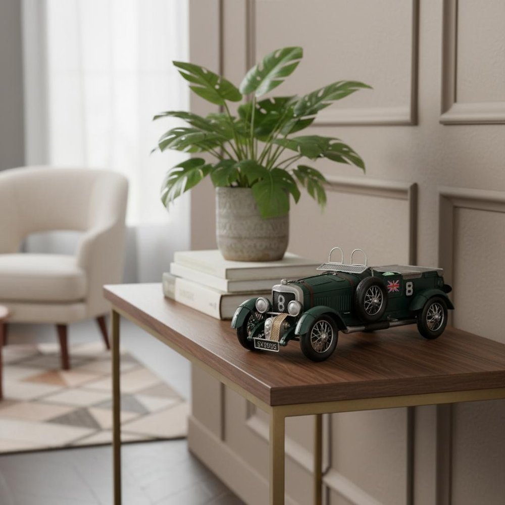 A must have for the collector and enthusiast, this c1930 Bently Blower British Race Car Model Sculpture is made iron and finished in antiqued green color and with a scale of 1:13 is designed to be an authentic looking replica.This unique vintage model is a piece of art that comes complete with unqique details like the supercharger sitting in the front of the car. A great accent for your car enthusiast! 5" x 13.5" x 5"