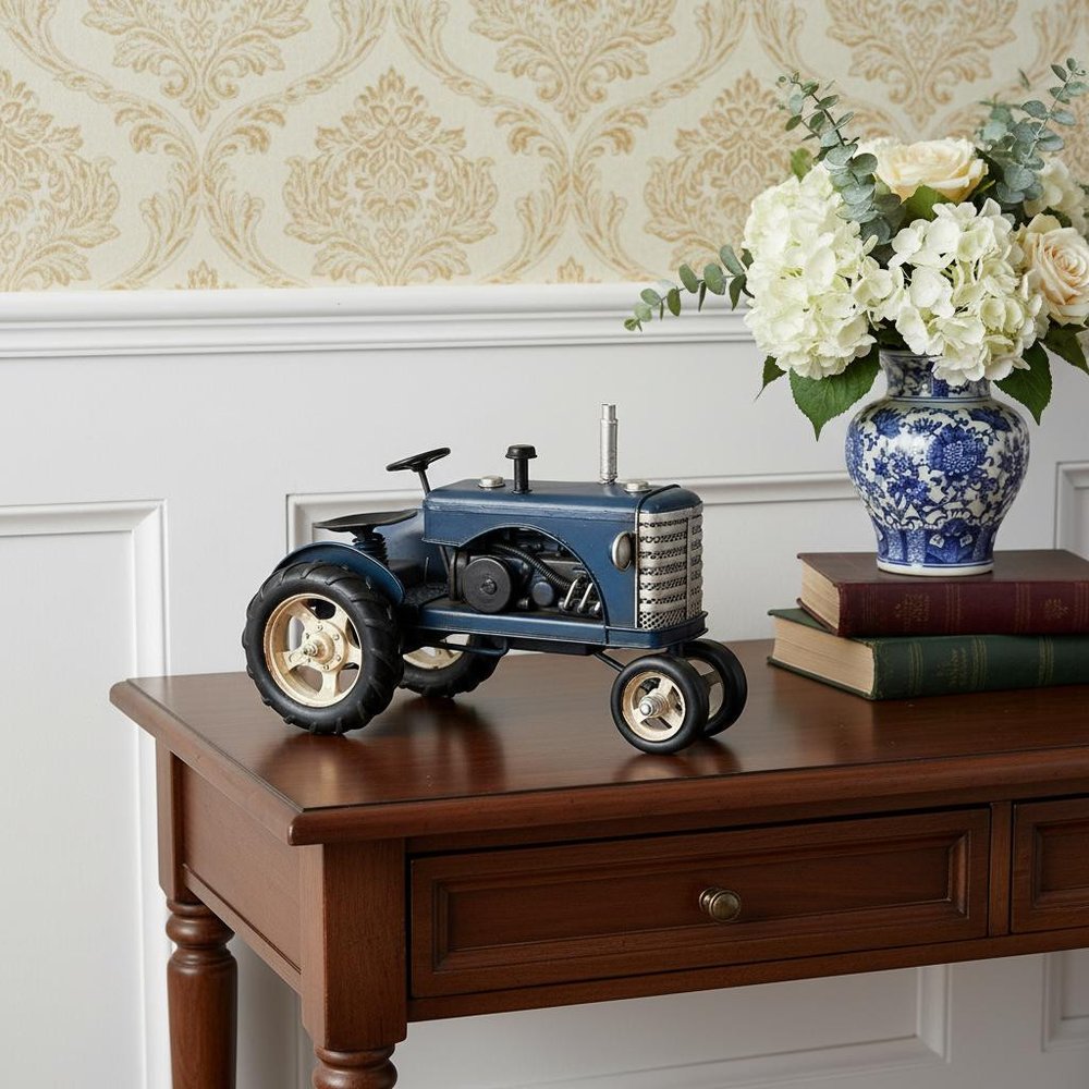 Original and beautifully detailed, the c1956 Massey Harris 333 Tractor Sculpture is an authentic replica of the icon of 50's agriculture. Hand-made from metal and hand-painted in a dark blue color it is a true eye-catcher. Collectors will truly appreciate its stunning details like rolling wheels, a seat, two axles, a steering wheel, and much more. A great collection piece for anyone interested in this period. 7'' x 9'' x 6"