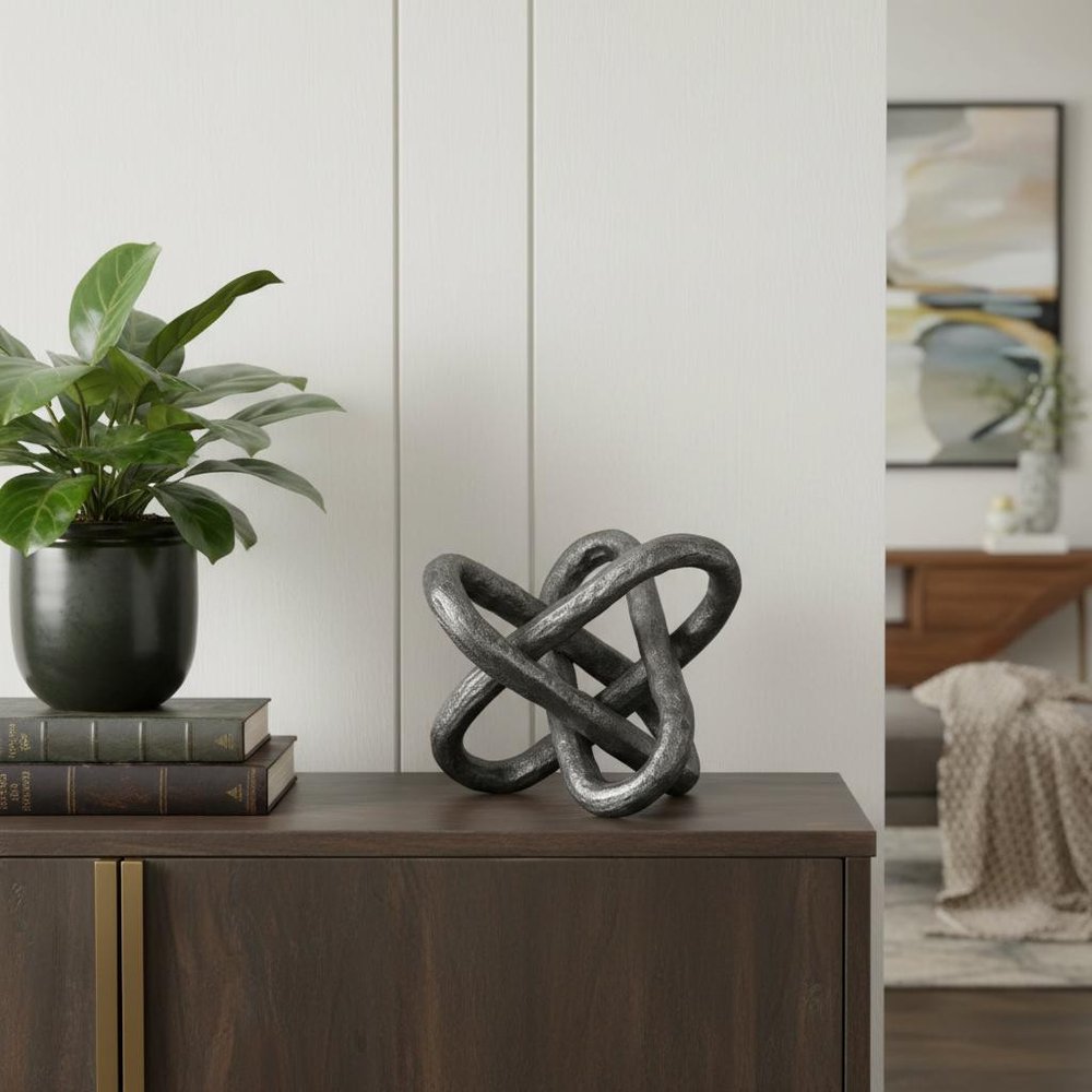 With this Petite Silver Metal Chain Link Sculptureyou can add the perfect touch of industrial design to your home. This piece is made from solid metal and has a vintage inspired silver gray finish on top. There are three separate oval metal shapes that intersect to create this 3D chain link shape. This decor piece will look great in any room in your home owing to its neutral colorway. Display it on your bookshelf, or use it as coffee table decor. 7" H x 7" W x 7" D