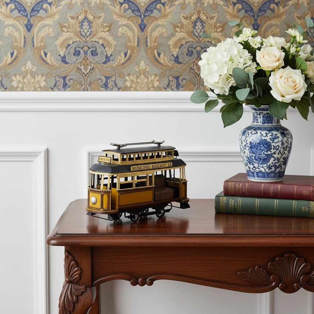 Authentic and super detailed, the Railway Cable Car Sculpture is a unique handmade replica of a municipal cable car. It was handmade by a master craftsman in 100% metal and originally painted. It features many details such as seats, wheels, headlight, and decal insignia. It is a great display piece and a sought-after piece for collectors and enthusiasts. 3.5" x 10.5" x 6.5"