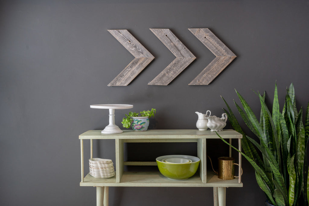 This set of three gray distressed wood hanging arrow dimensional sculptures will add a beautiful decorative accent to your walls. Hand-finished with care, this multi-piece wall decor set will bring some authenticity to your space. Hand-crafted from genuine reclaimed wood, these geometric arrow pieces are purposefully distressed and weathered. Hang together or separately vertically or horizontally to create a unique rustic look. 14-inch h x 11-inch w x 1-inch d.