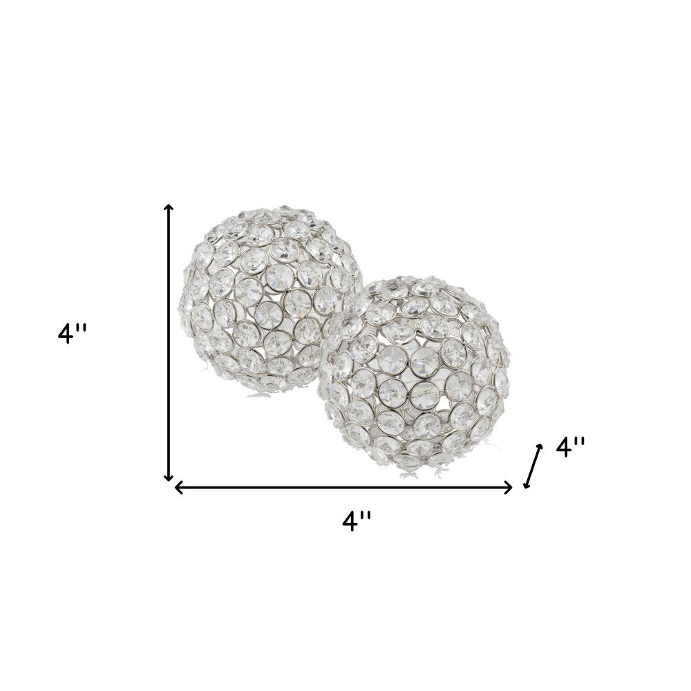 This set of two clear and silver faux crystal and steel decorative orb tabletop sculptures will add a beautiful decorative accent to your decor. Featuring a modern glam style, this fabulous set of two spheres will elevate the look of your space and add a touch of sparkle to your space. Expertly made of high grade faux crystal and metal wire, this pair can be displayed together or separately. Display on a shelf or use as filler in a basket or vase. It's a perfect addition for those who love an up-to-the-minute look and feel. 4-inch h x 4-inch w x 4-inch d.
