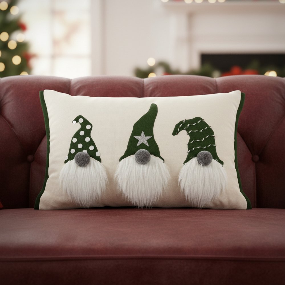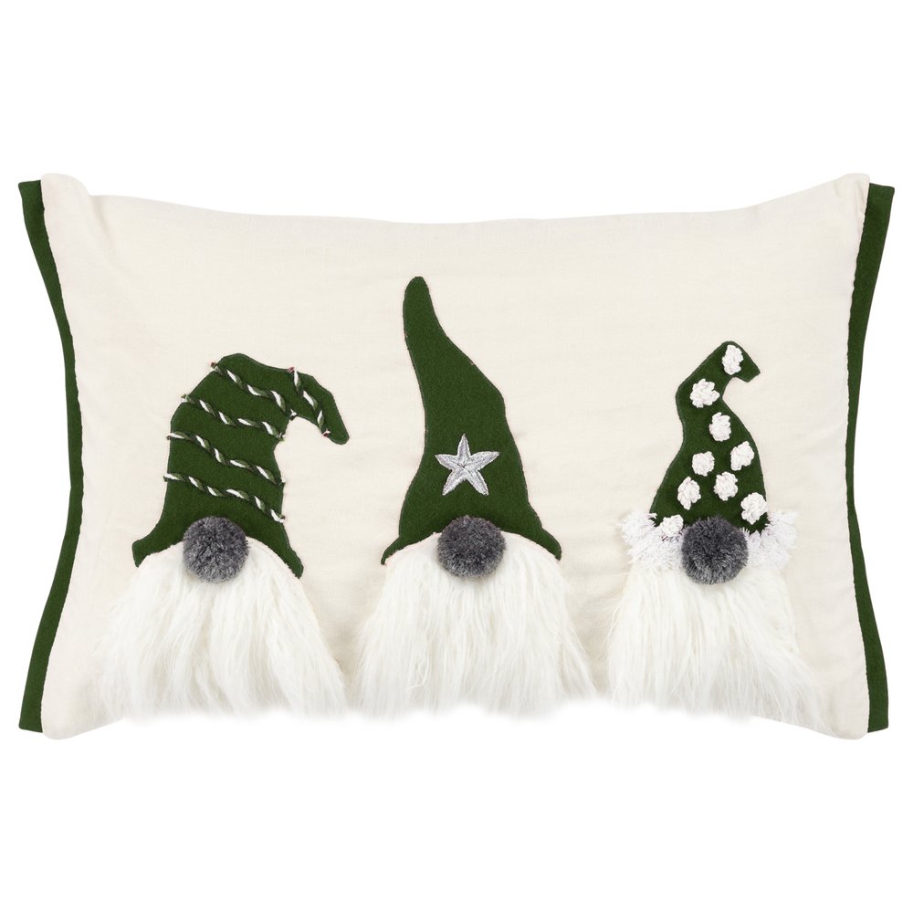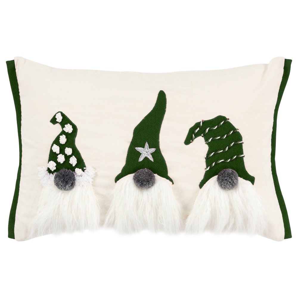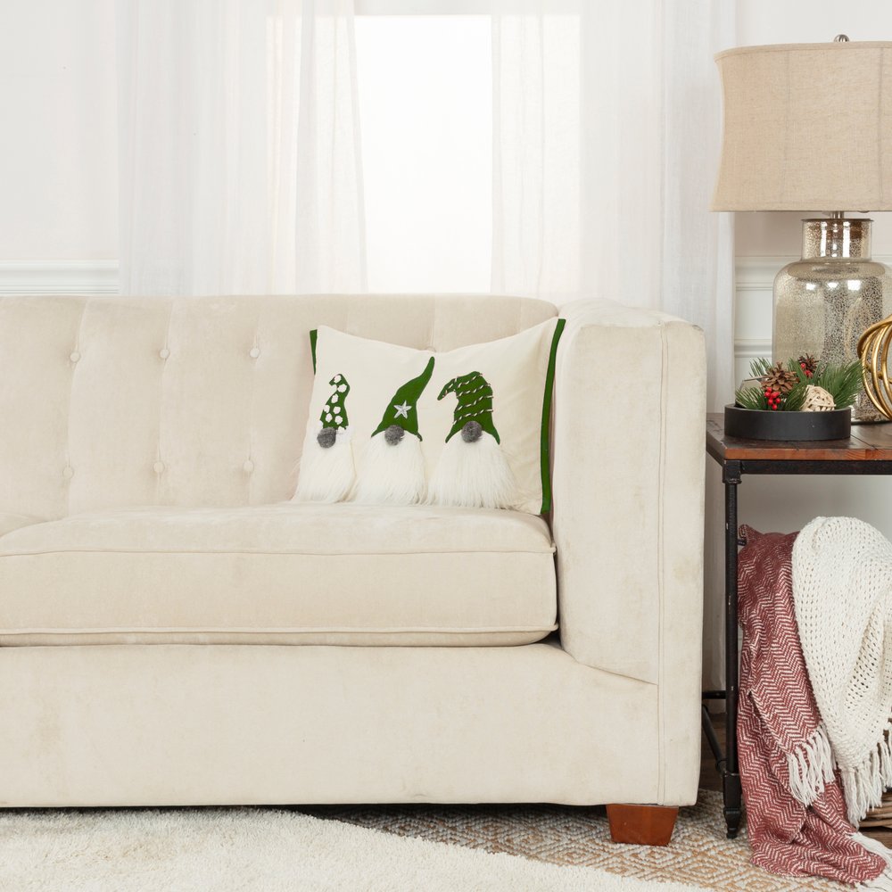 This 14-inch x 20-inch green and ivory cotton Christmas gnomes throw pillow with embroidery is a great way to celebrate and decorate for the holidays. This fun pillow represents quality construction, expertly made from durable cotton that is not only long lasting but soft to the touch as well. Featuring a trio of textural gnomes with embroidery and embellishments that will bring a smile to all who visit. Super soft and built to hold its shape, this polyfill-filled pillow is a great option. A great way to add some festive and unique spirt to your space for the season. 14.00-inch h x 20.00-inch w x 6.50-inch d.