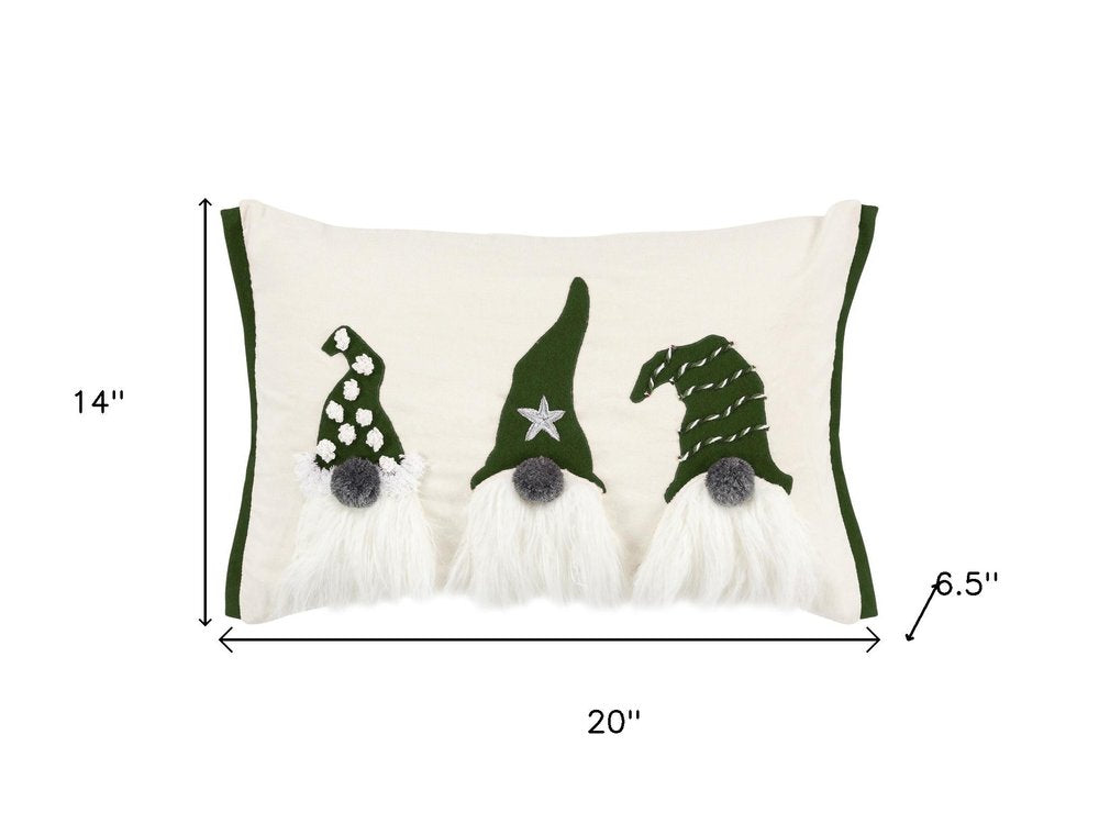 14" X 20" Green And Ivory Cotton Christmas Gnomes Throw Pillow With Embroidery