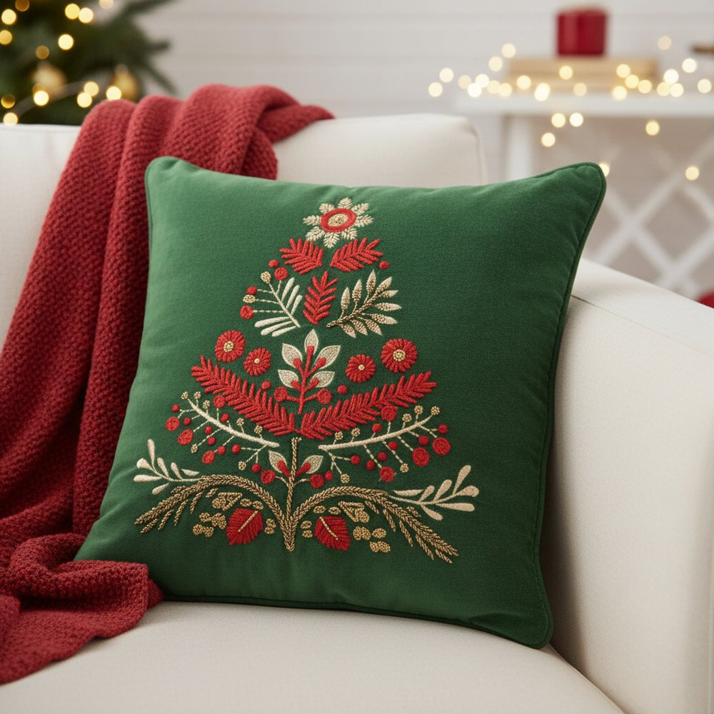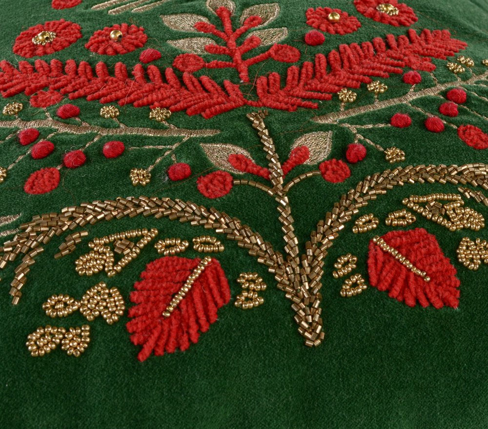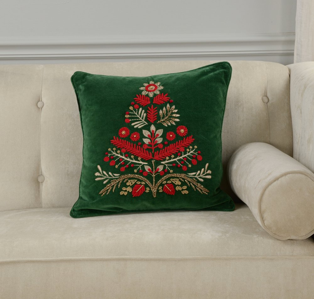 Set a festive holiday mood with this cozy and comfy 18-inch green and red floral velvet cotton Christmas tree throw pillow. Features beautifully hand-embroidered decorative Christmas tree in red and green that adds some high end and hand-crafted textural designer touches. This soft polyfill filled pillow not only is decorative but made to be comfy and cozy all day long. For anyone that loves to decorate or accent their space with color and texture. A great decorative accessory to add color and dimension to your favorite chair, accent your sofa, or to use as part of your bed ensemble. 18.00-inch h x 18.00-inch w x 6.50-inch d.