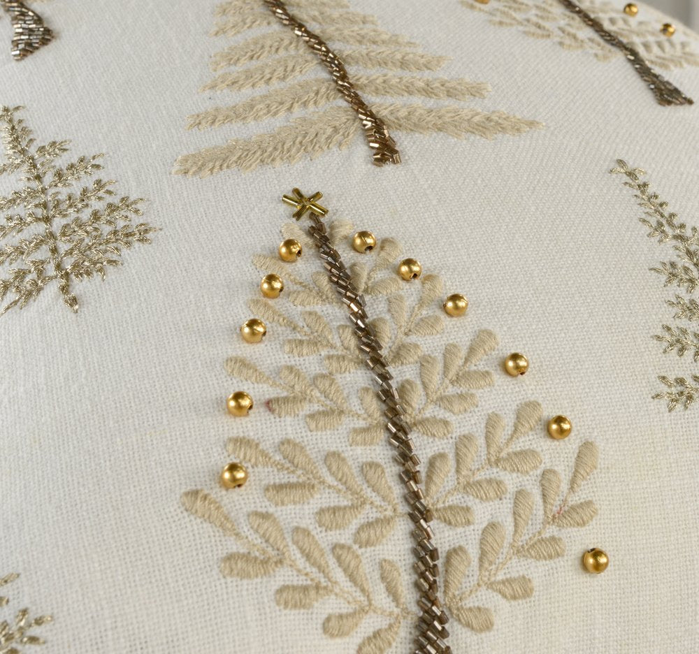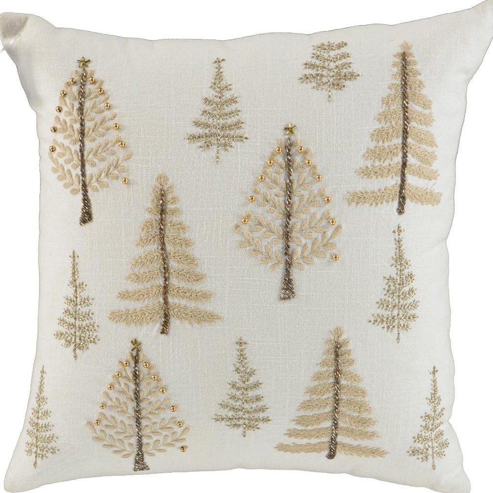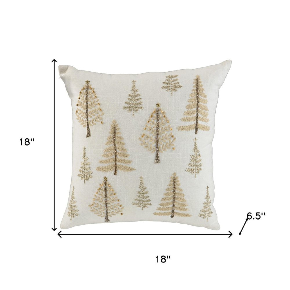 18" Natural Silver And Gold Cotton Christmas Trees Throw Pillow With Beads And Embroidery