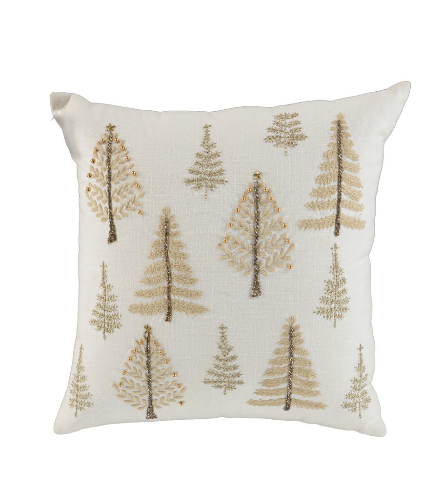 This 18-inch natural silver and gold cotton Christmas trees throw pillow with beads and embroidery is the perfect way to celebrate and decorate your living room, family room, bedroom, or office for the holidays. Features beautifully hand-embroidered decorative Christmas trees with metallic beading that adds some high end and hand-crafted textural designer touches. This soft polyfill filled pillow not only is decorative but made to be comfy and cozy all day long. For anyone that loves to decorate or accent their space with color and texture. A great decorative accessory to add color and dimension to your favorite chair, accent your sofa, or to use as part of your bed ensemble18.00-inch h x 18.00-inch w x 6.50-inch d.