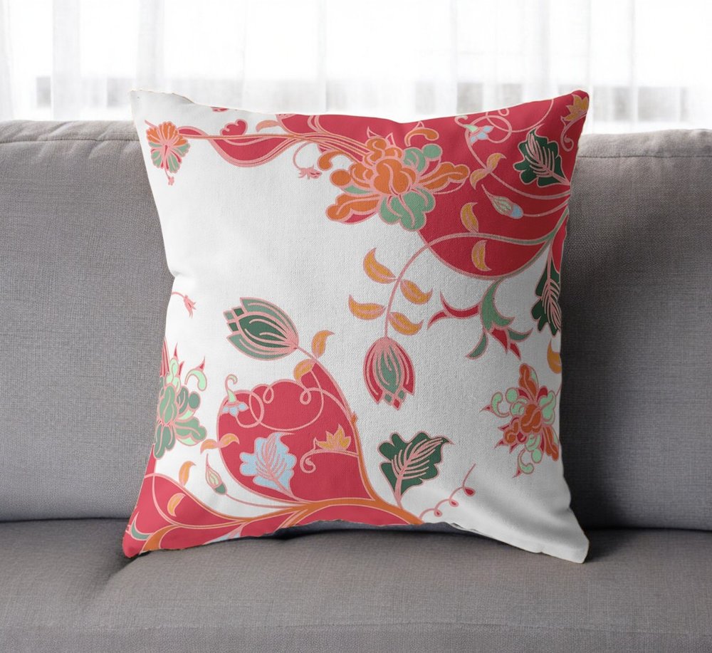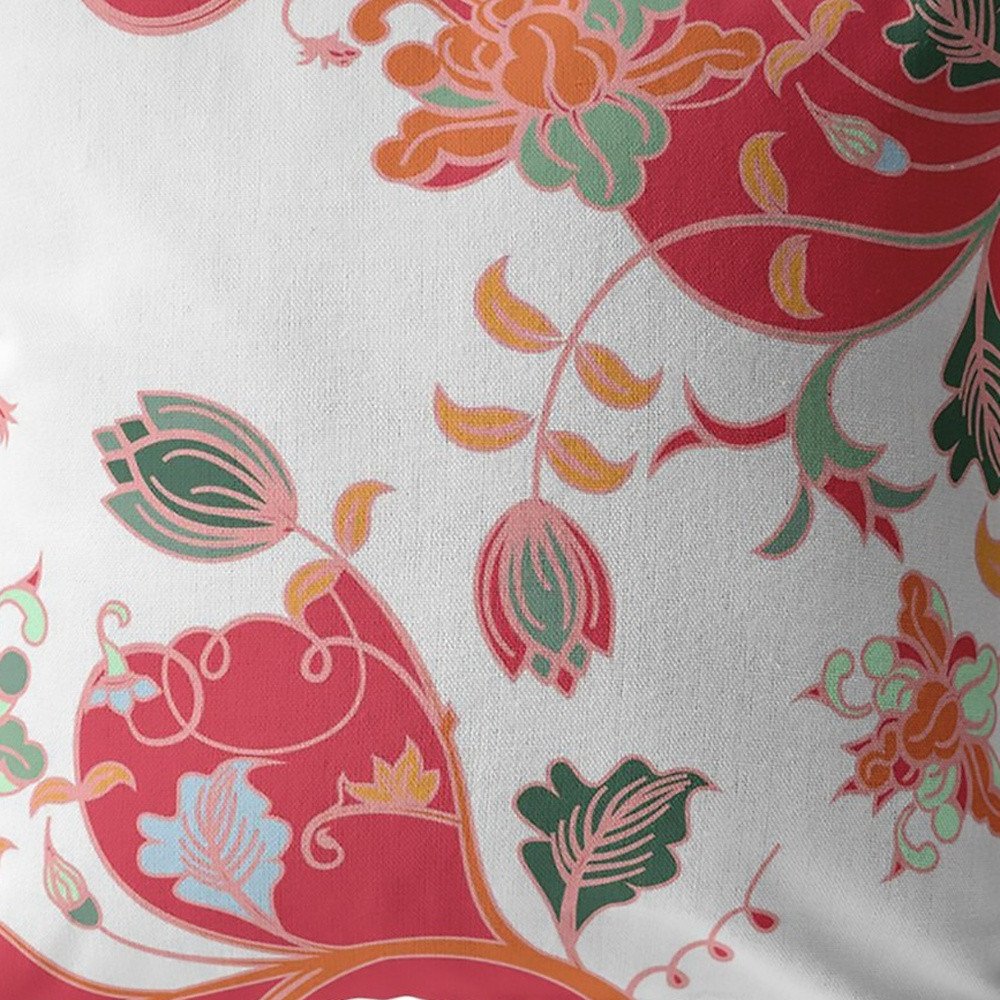 Accentuating a new dimension to traditional designs, this gorgeous Red White Garden Decorative Suede Throw Pillow is bound to brighten up any contemporary space. The unique pillow hosts vibrant floral motifs in raspberry red, hunter green, and orange with a pearl white base to bring a welcoming tone to your home. The detailed work on the floral elements comes to life due to the high-quality print that is made to last long and retain color intensity. Crafted in the USA from leather-like suede fabric for ultimate softness and durability that gives this pillow a luxurious look and feel. This blown pillow comes with a high-quality polyfill insert that makes the pillow super soft and fluffy for a comfortable resting experience. Let your living space fill with colors and happiness as you pair this stunning decorative pillow with warm or cool-toned interior decors. 18” x 18” x 5”