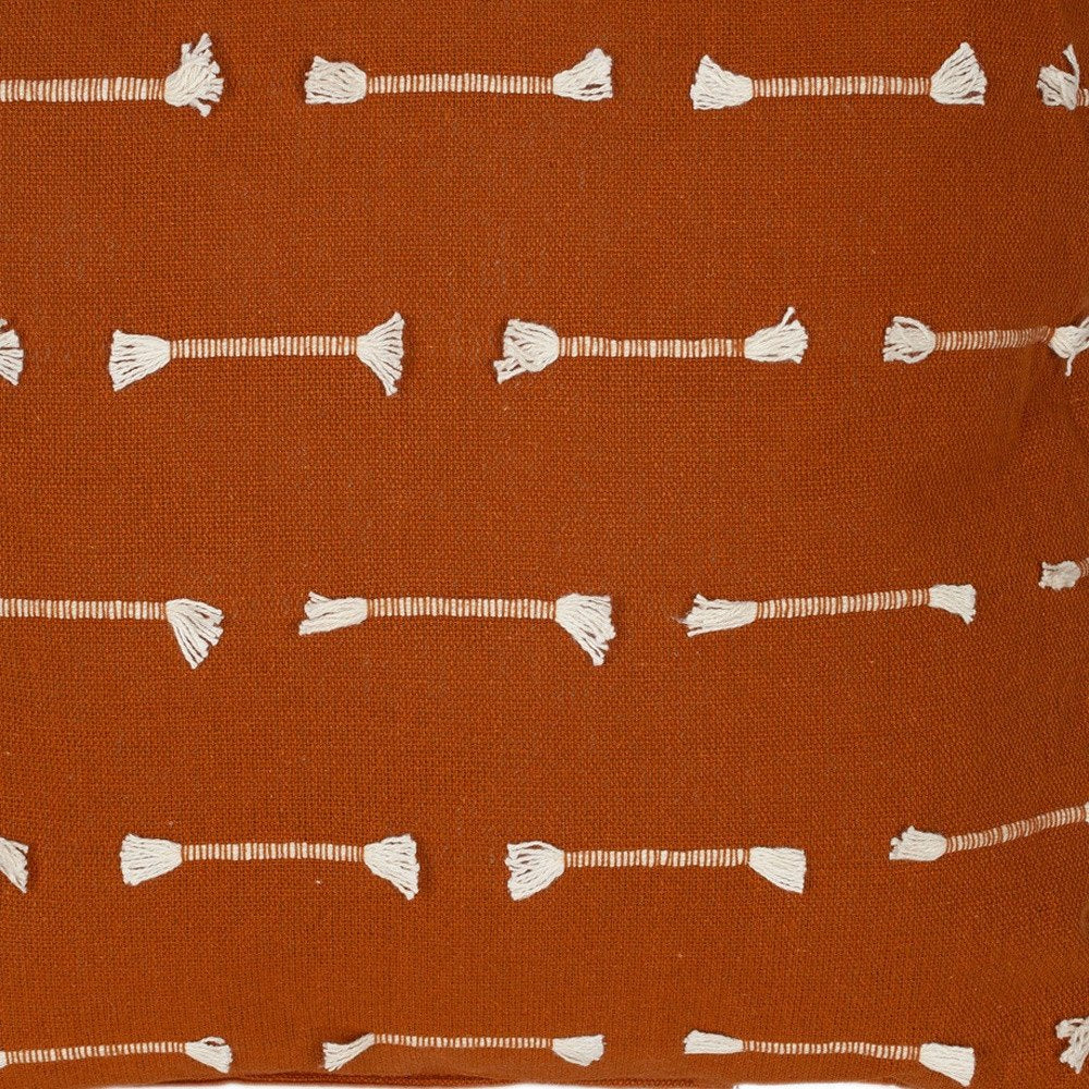 Add an air of fashion to your room and rejuvenate the space with this cute and fashionable 18-inch terra cotta striped cotton throw pillow with texture. This terra cotta hued piece represents quality construction, features textural fringed embellishments, and is expertly made from durable cotton that is not only long lasting but soft to the touch as well. Super soft and built to hold its shape, this polyester pillow is a great option. For anyone that loves to decorate or accent their space with color and texture. Decorative pillows are a great way to change up the look and feel of your space easily and quickly. 18-inch H x 18-inch W x 4-inch D