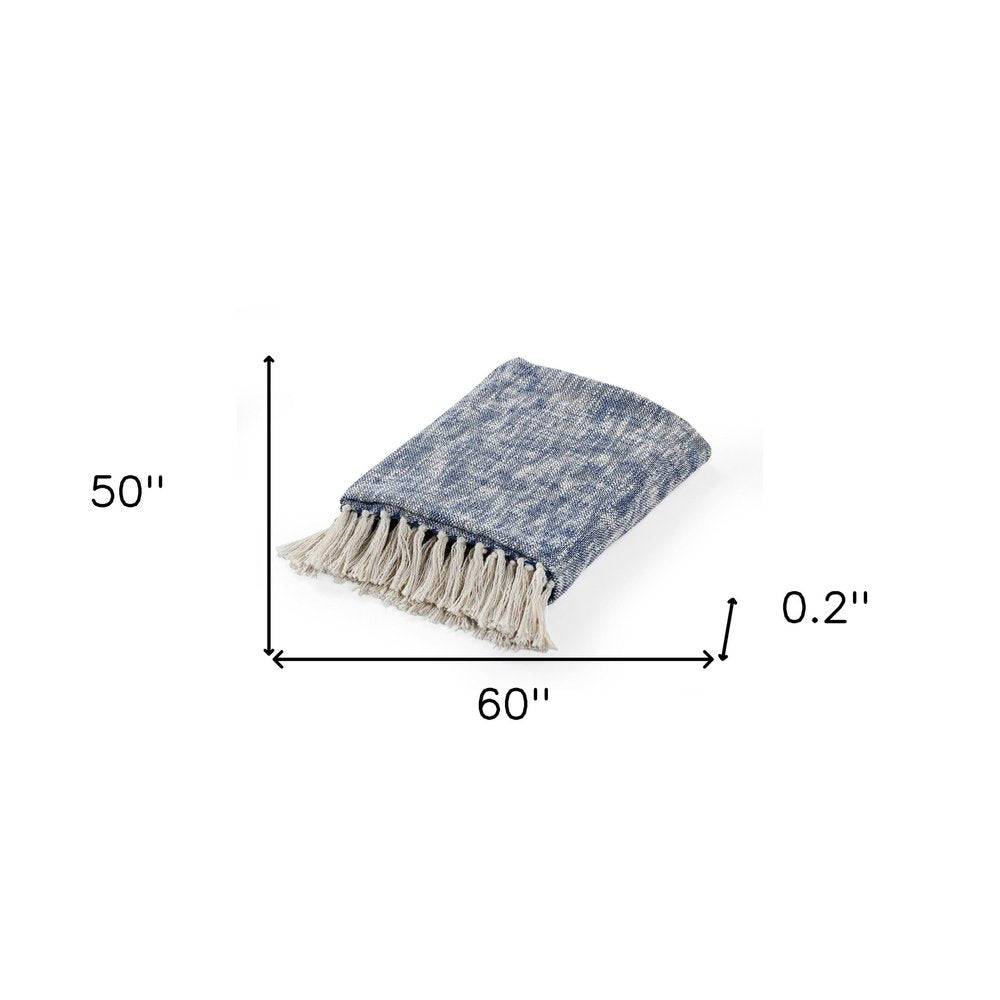 This 50-inch x 60-inch blue and white woven cotton throw blanket with fringe brings a classic, refined style to your space. Features a woven solid color design that offers sumptuous softness and texture that you'll cherish for years to come. Made from cotton this blanket will make a great addition to any room it's added to. Layering your furnishings with a decorative throw has the ability to awaken a tired living room or elevate the design of your bedroom simply by providing elements of color and texture that weren't there before. Perfect for your favorite chair, bed or lounging on the couch, this blanket helps bring a warm and fashionable flair to your space. 60-inch H x 50-inch W x 0.2-inch D