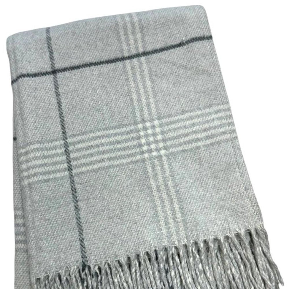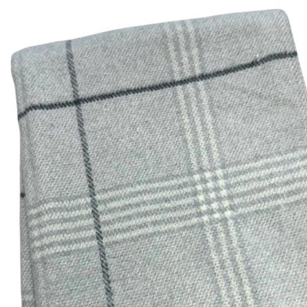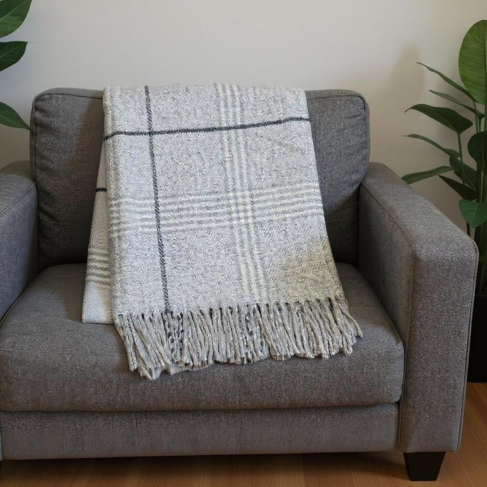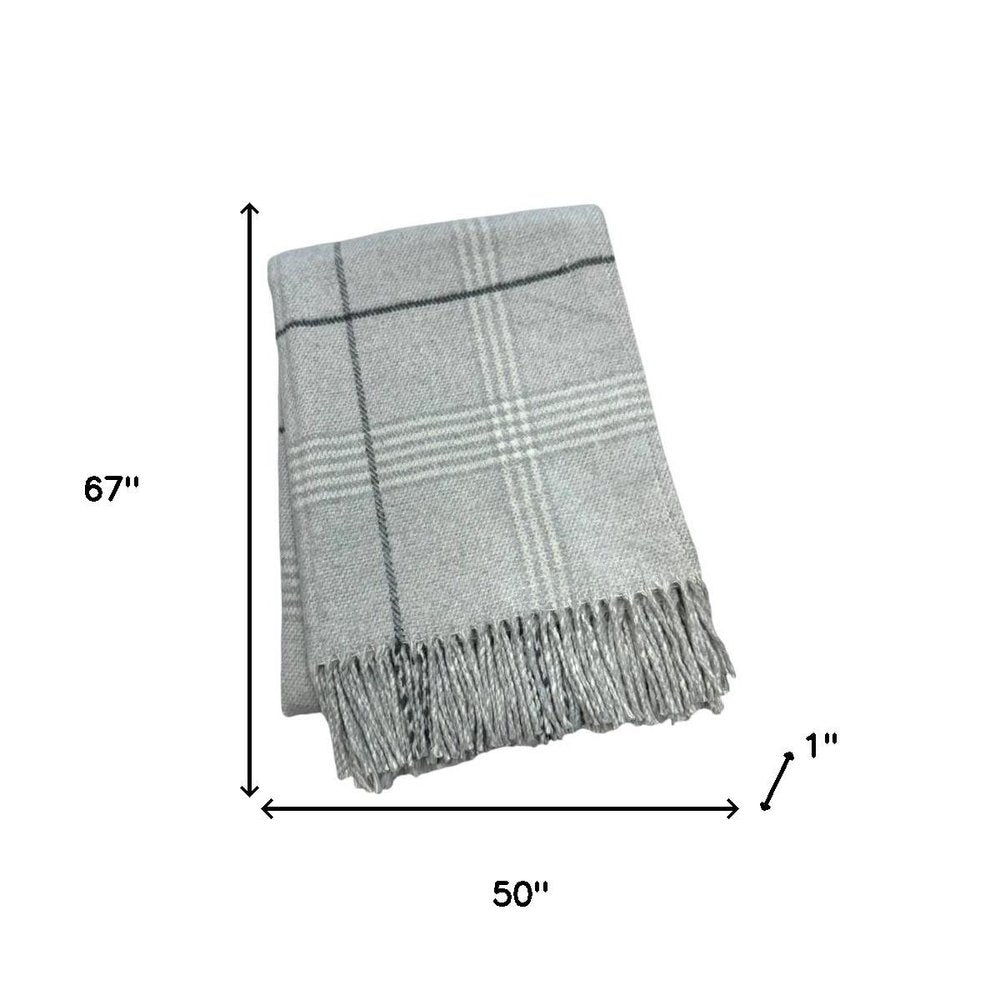 50" X 67" Light Gray And White Cotton Blend Woven Plaid Throw Blanket with Fringe