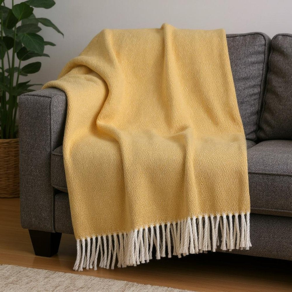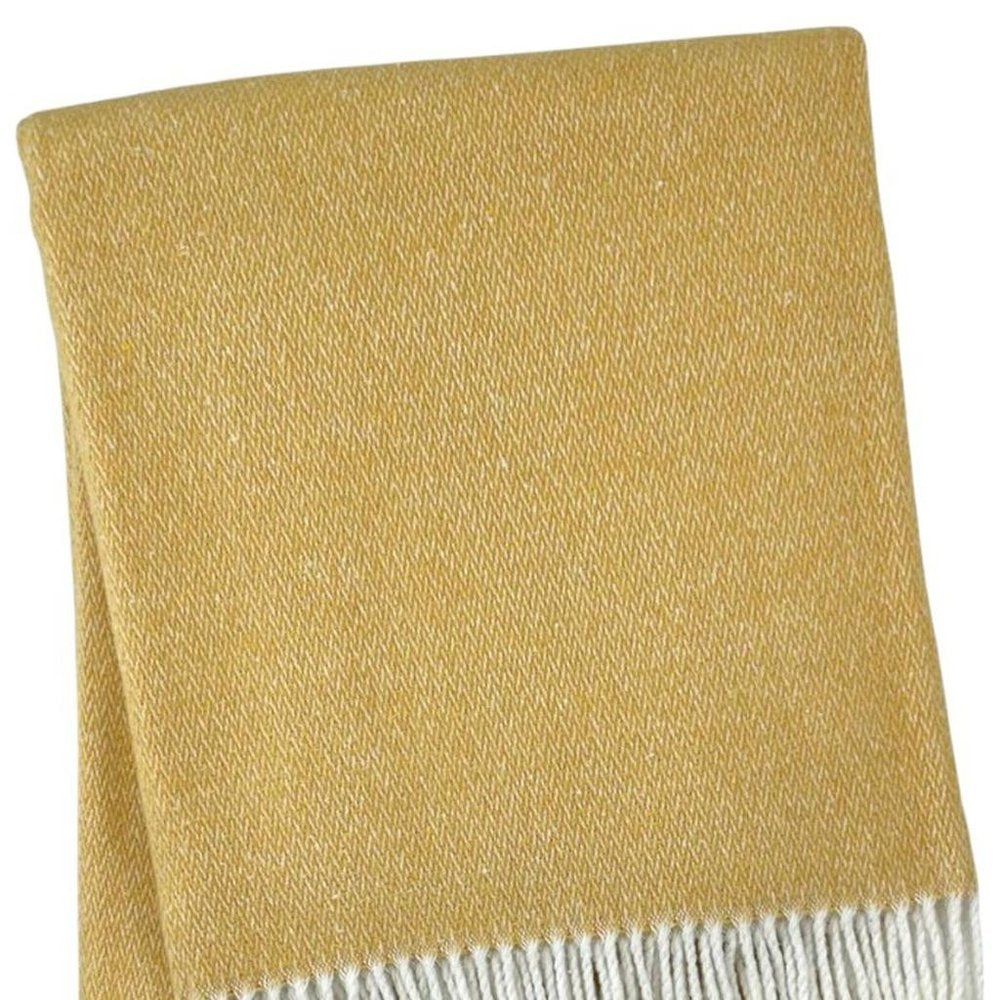 This welcoming 55-inch x 70-inch gold and white microfiber and cotton woven herringbone plush throw blanket with fringe is a must-have for every sofa, chaise, and bed. This plush throw is cozy soft beyond belief and oh-so-giftable. Features a woven herringbone design that offers sumptuous softness and texture that you'll cherish for years to come. Made from microfiber and cotton this blanket will make a great addition to any room it's added to. Layering your furnishings with a decorative throw has the ability to awaken a tired living room or elevate the design of your bedroom simply by providing elements of color and texture that weren't there before. Perfect for your favorite chair, bed or lounging on the couch, this blanket helps bring a warm and fashionable flair to your space. 70-inch h x 55-inch w x 1-inch d.
