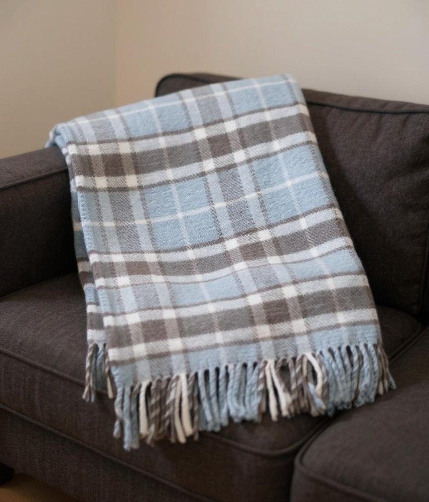 This 55-inch x 70-inch sky blue and brown microfiber and cotton woven plaid plush throw blanket with fringe is a stylish addition to any sofa. This plush throw is cozy soft beyond belief and oh-so-giftable. Features a woven plaid design that offers sumptuous softness and texture that you'll cherish for years to come. Made from microfiber and cotton this blanket will make a great addition to any room it's added to. Add extra texture to your decor and turn your room into an inviting space. This cozy throw blanket makes the perfect add-on to movie nights and lazy afternoons. 70-inch h x 55-inch w x 1-inch d.
