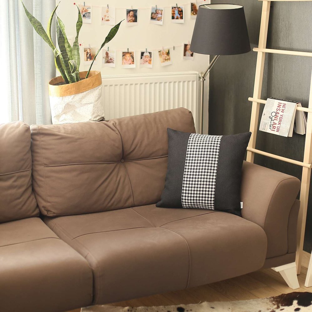 Emphasizing the elegance of modern artistry, this Black and White Houndstooth Throw Pillow will induce a rich and luxurious appeal to your contemporary living space. The matte black surface flanking a midsection with black and white jacquard weaved houndstooth pattern to elevate the entire look for visual contrast. Skilfully crafted in Turkey with OEKO-TEX Standard 100 certified polyester fabric to ensure high product safety and durability. This pillow should only be spot cleaned to keep its shine for years to come. For a seamless unified finish on the touch, the pillow sport an all-around hidden zipper closure while the soft poly filling inside provides maximum comfort. This classic decorative pillow will effortlessly blend in your modern household and align with your sense of interior styling. 18” x 18” x 1”