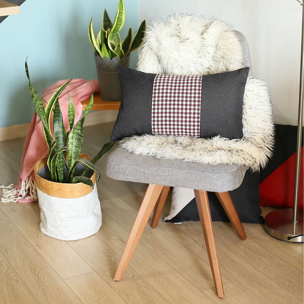 Embodying the beauty of modern artistry, this Red and Black Houndstooth Lumbar Throw Pillow will bring an elegant touch to your contemporary décor. The black and maroon red jacquard weaved houndstooth pattern in the center of the matte black base creates an alluring visual experience. Durability and longevity is ensured by fine Turkish craftsmanship with OEKO-TEX Standard 100 certified polyester fabric. The handmade pillow only needs to be spot cleaned to keep it looking pristine for ages. To give it a seamless and uniform look, the zipper is kept in a hidden closure. The eco-friendly and nonallergenic insert is not only easy to clean but also provides a soft and cozy feel to the touch. Your modern home will look its best with this decorative throw pillow while helping you express your love of classy patterns. 12” x 20” x 1”