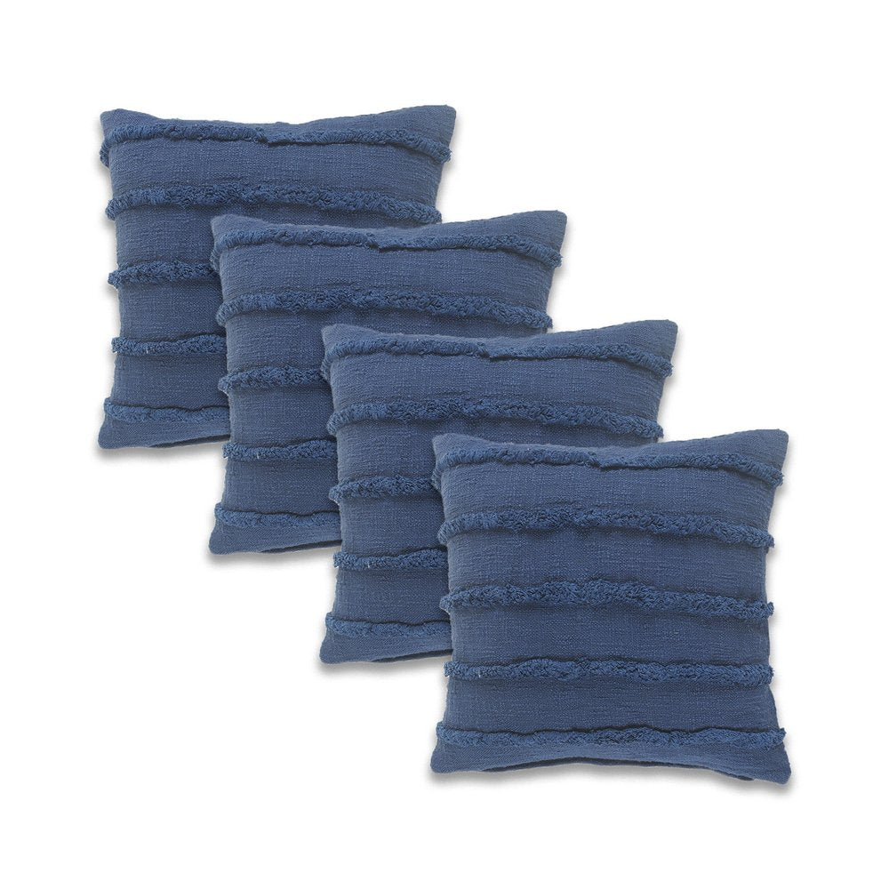 This set of four 20-inch dark blue striped cotton throw pillows will add a beautiful decorative accent to your decor. Ultra durable dark blue cotton has been used to make this decorative pillow set a beautiful look that will stand the test of time. This soft polyfill filled pillow not only is decorative but made to be comfy and cozy all day long. Emblazoned with the text these pillows add some visual interest and decor to your space. Great to use on its own or mix with other decorations for the perfect look. A great decorative accessory to add color and dimension to your favorite chair, accent your sofa, or to use as part of your bed ensemble. 20.00-inch h x 20.00-inch w x 4.00-inch d.