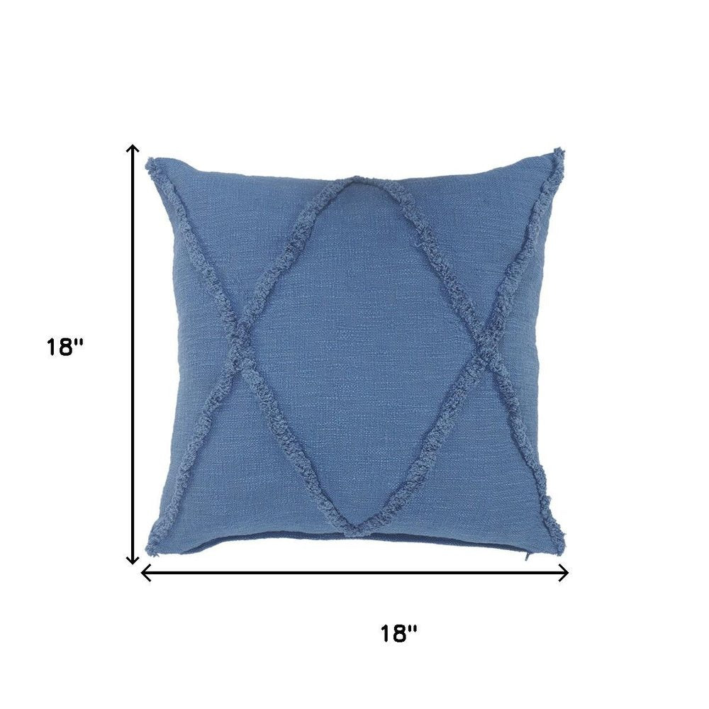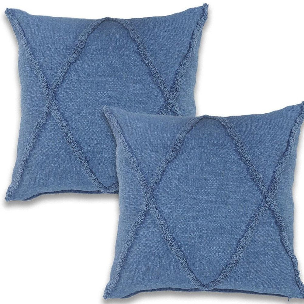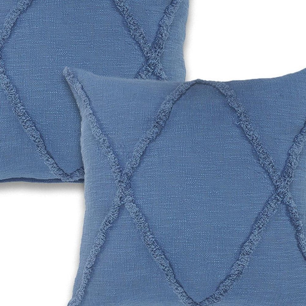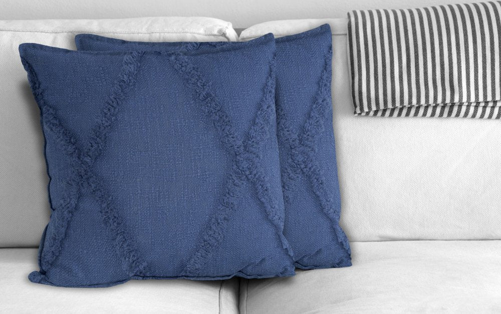 This set of two 18-inch blue and denim blue lumbar diamond cotton throw pillow covers will add a beautiful decorative accent to your decor. The blue and denim blue coloring of the extremely durable and long lasting cotton pillow covers will add dimension and texture to your space. Decorative pillow covers are a great way to change up the look and feel of your space easily and quickly. Combine with your own fill or insert to add decoration and dimension to your favorite chair, accent your sofa, or to use as part of your bed ensemble. 18.00-inch h x 18.00-inch w x 0.25-inch d.