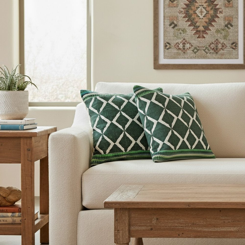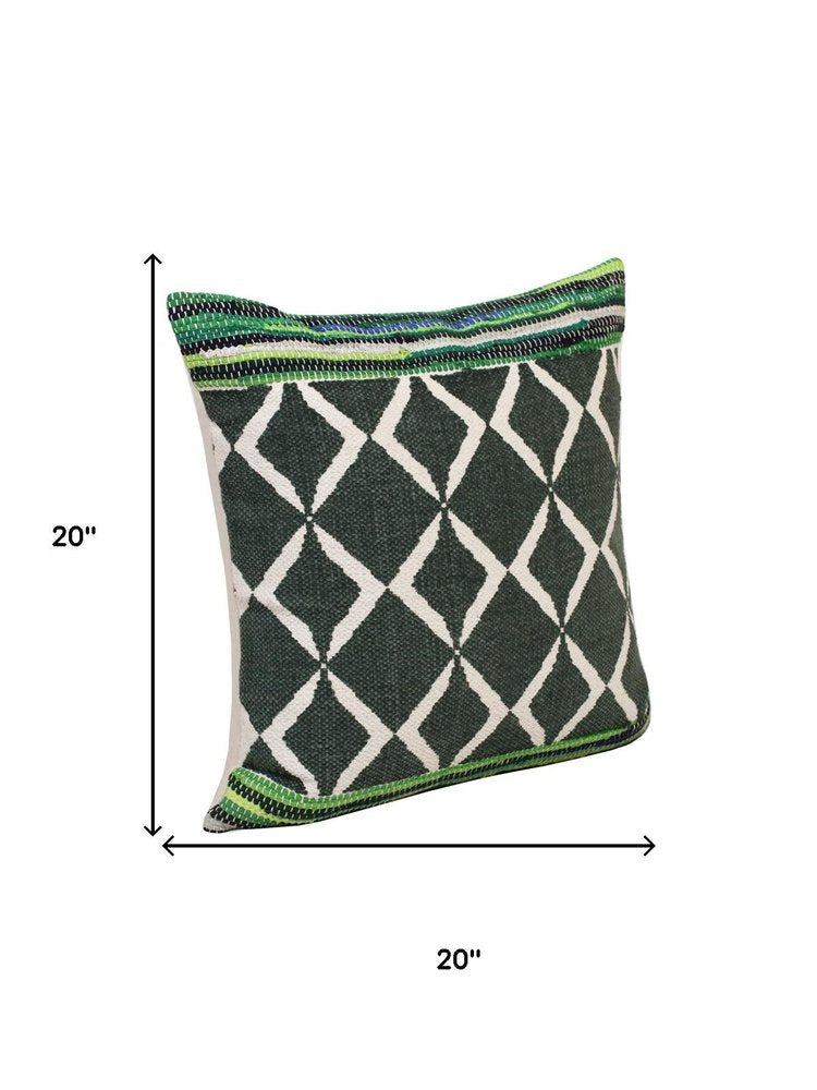 Set of Two 20" Green And Ivory Geometric Cotton Blend Throw Pillows