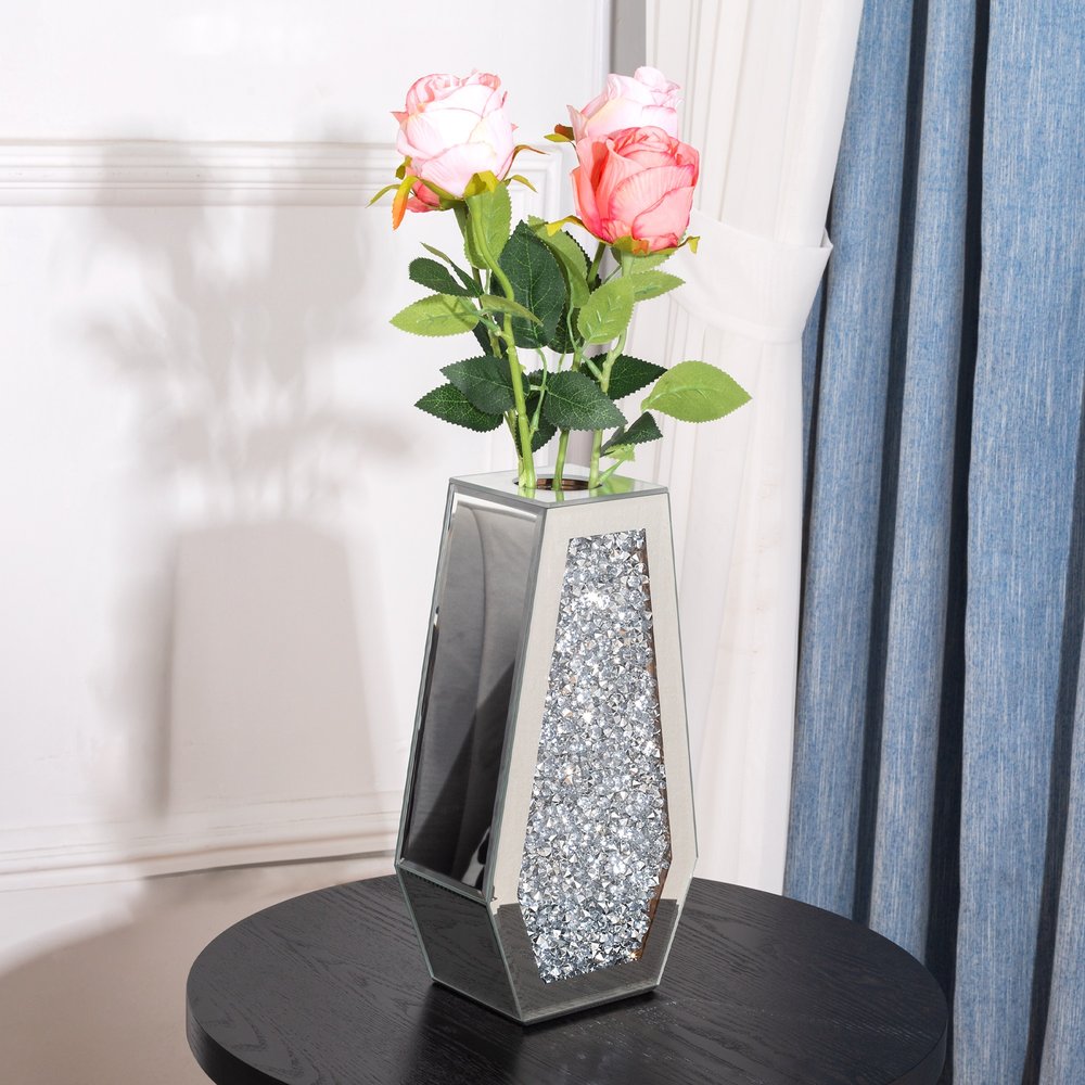 Ideal for displaying fresh or dried flowers, it effortlessly elevates your home ambiance. This elegant table vase is crafted from luxurious faux crystal and mirrored glass, making it a stunning centerpiece for any room. Its sleek design reflects light beautifully, adding a touch of sophistication to your décor. This sparkly, watertight vase works well with both real and faux flowers. Use it as a standalone piece or pair it with other decorative elements to create a captivating display that enhances your living space with style and grace. 11.81-inch h x 3.11-inch w x 6.22-inch d.