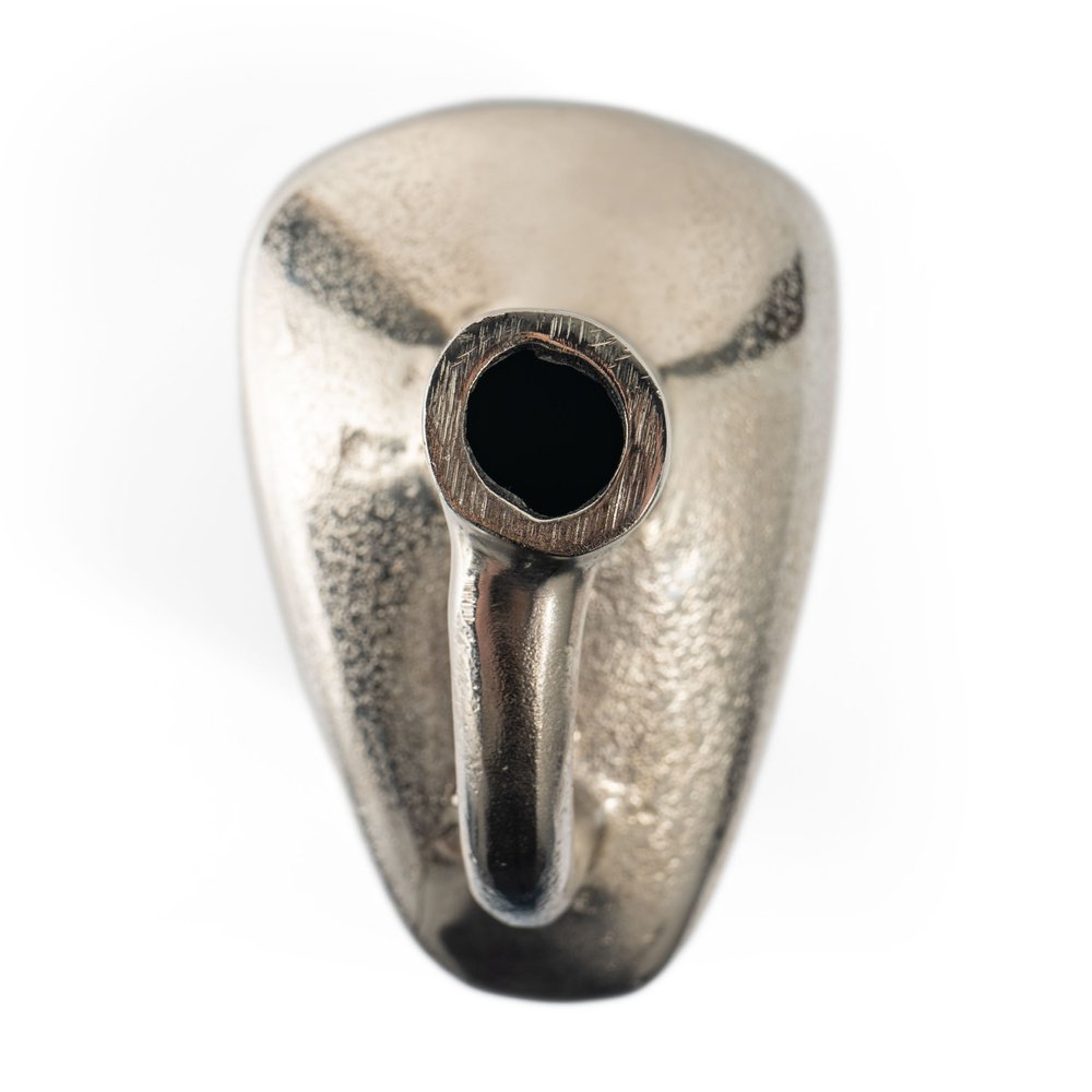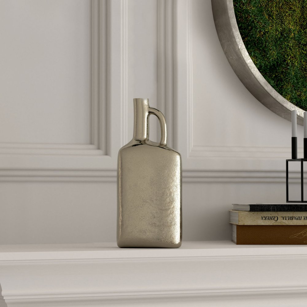 The 14-inch silver aluminum jug table vase is a stunning piece that adds a touch of elegance to any space. Crafted from durable cast aluminum, this vase showcases a beautiful silver finish that catches the eye. Its purposeful distressing enhances the modern aesthetic, making it a unique centerpiece for your table. The table vase design is perfect for displaying fresh flowers or dried arrangements, adding a stylish flair to your decor. This versatile piece can seamlessly blend into various design styles, elevating the overall ambiance of your home. Whether placed in a living room, dining area, or entryway, this vase serves as a statement piece that enhances your interior charm. 14-inch h x 6-inch w x 3-inch d.