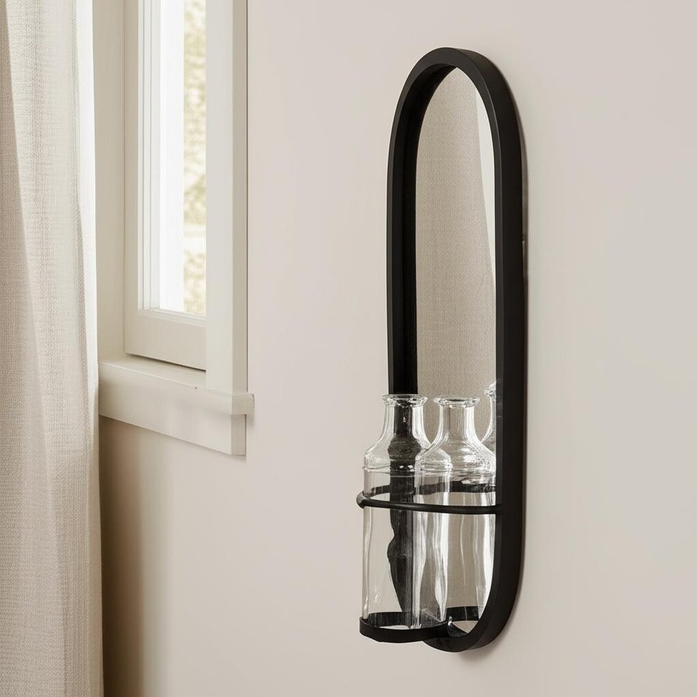 The 19-inch black and clear glass bottle metal and mirrored glass oval wall vase is a stunning addition to any contemporary space. This wall vase showcases an elegant oval shape that beautifully complements various decor styles. Crafted from durable metal and mirrored glass, it offers a modern aesthetic that catches the eye. Ideal for displaying fresh or dried flowers, this vase serves as both a functional item and a striking decorative piece, enhancing the ambiance of your home with its chic design. Elevate your interior with this stylish and versatile wall vase that seamlessly integrates into your living environment. 18.9-inch h x 8.07-inch w x 3.94-inch d.