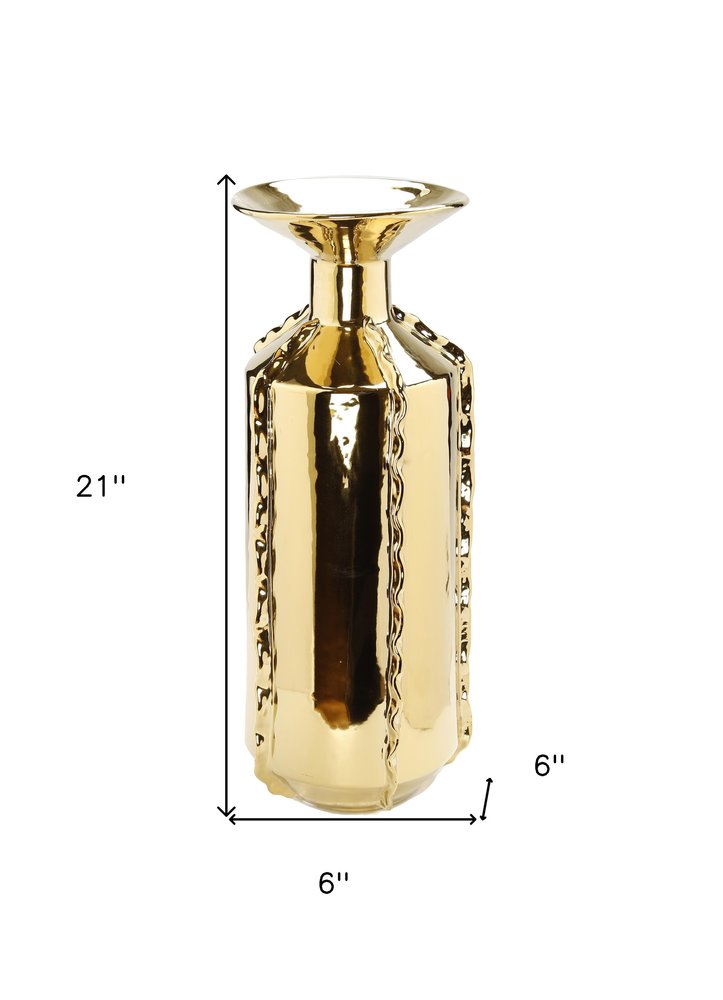 21" Gold Trumpet Ceramic Table Vase With Sculptural Details