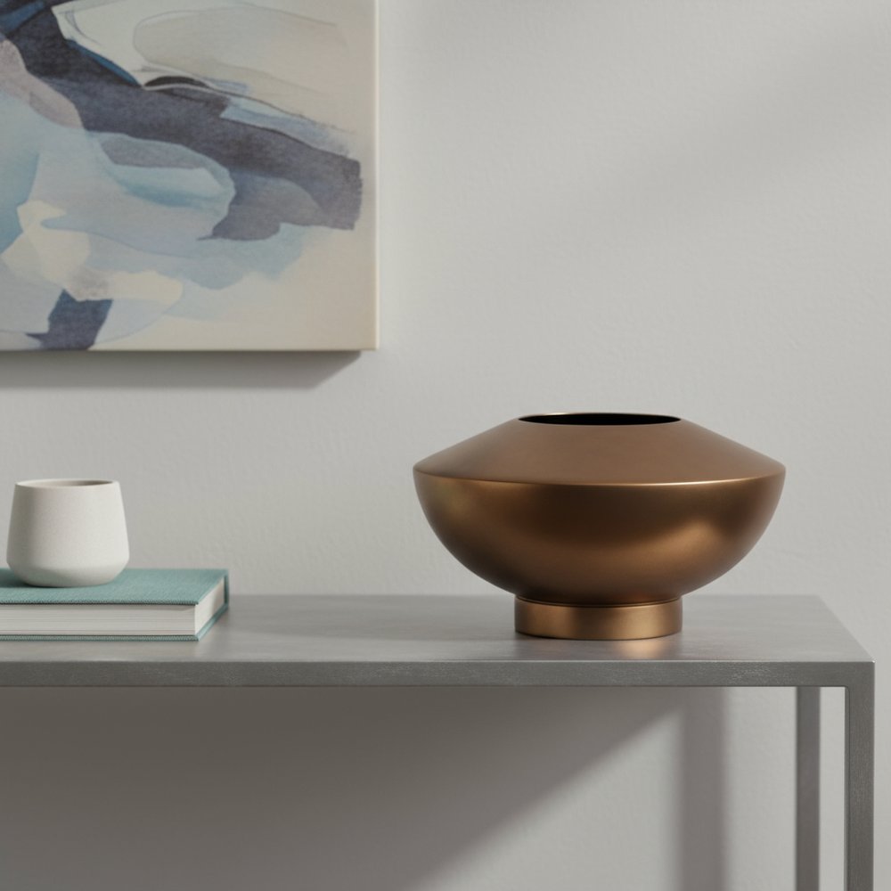 Ideal for displaying faux or dried flowers, it effortlessly elevates your home ambiance. This table vase showcases a unique distressed metal finish that adds character and charm to any space. Crafted from durable metal, it offers both longevity and style, making it a perfect addition to your decor. Its versatile design allows it to complement various interior aesthetics, from modern to rustic. Use it as a statement piece on a coffee table or a decorative accent on a shelf. With its eye-catching texture and functional purpose, this vase will undoubtedly enhance the visual appeal of your living environment. 4.50-inch h x 8.25-inch w x 8.25-inch d.